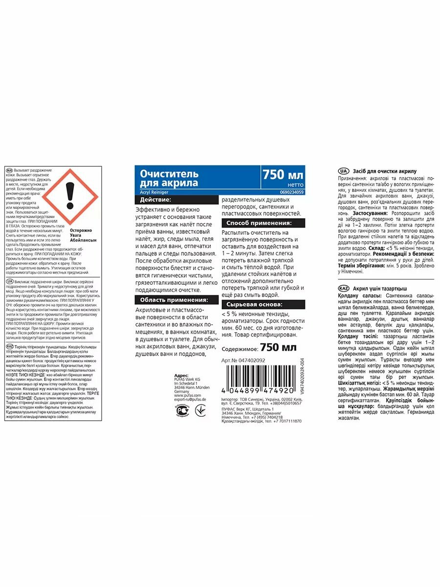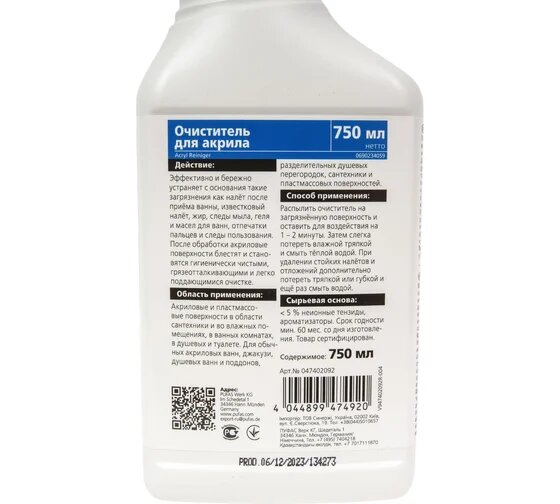 Очиститель для акриловых ванн, душевых кабин, джакузи,750 мл