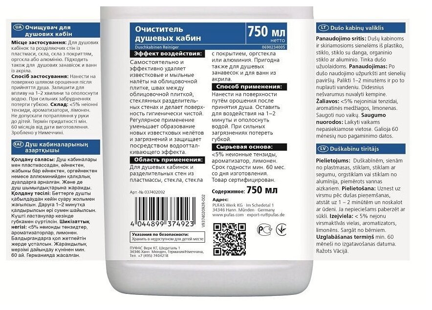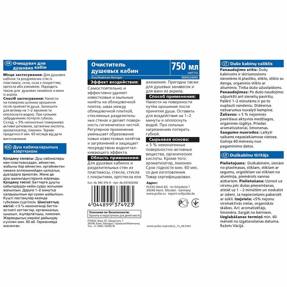Купить Пуфас Glutoclean N374 Очиститель для душевых кабин (0,75л) Gl Duschkabinen Reinig