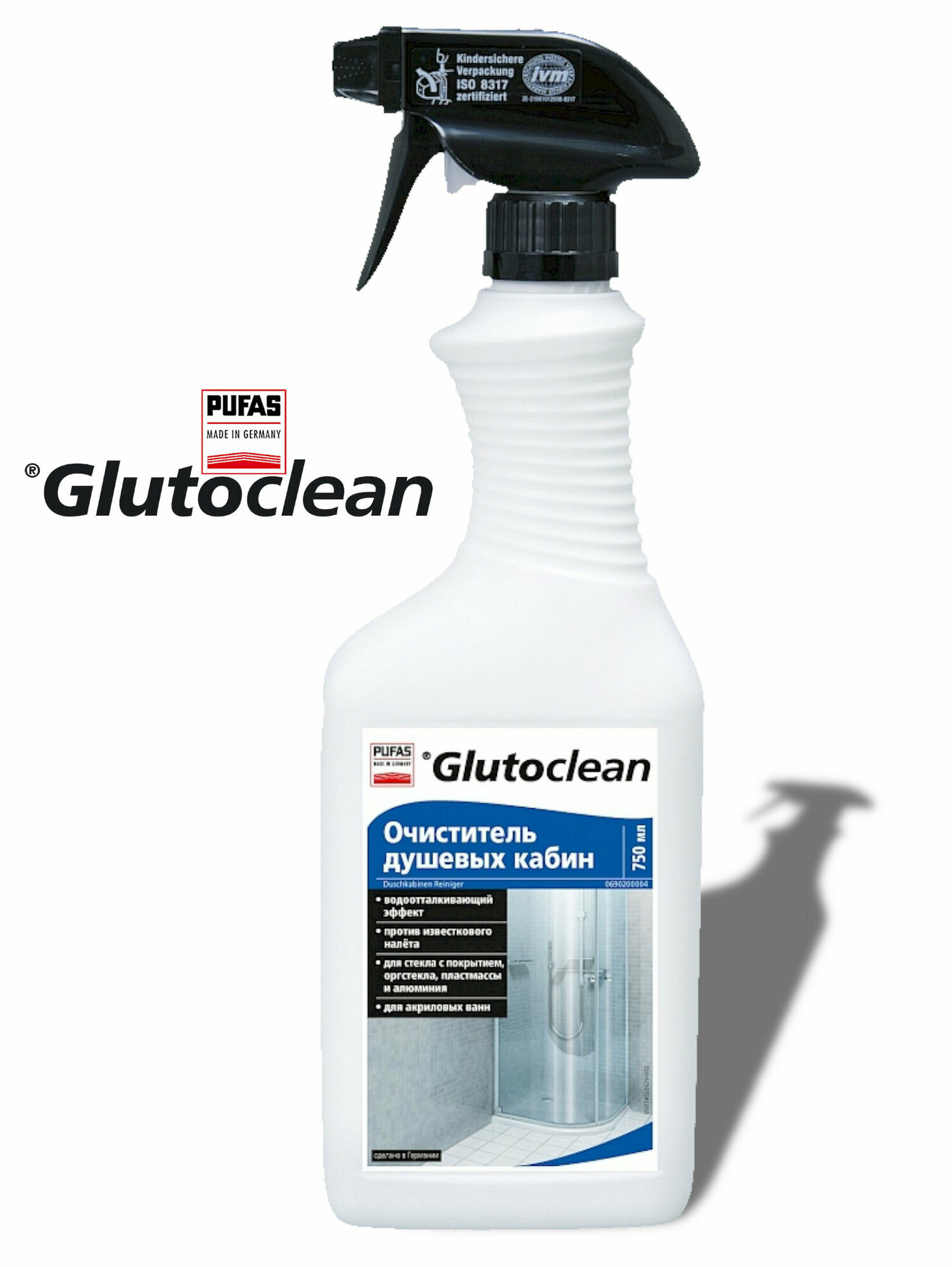 Очиститель для душевых кабин, Pufas Glutoclean, 750 мл.для удаления известковых и мыльных налетов на облицовочной плитке, швах между плиткой, стеклянных разделительных стенах и душевых занавесках.