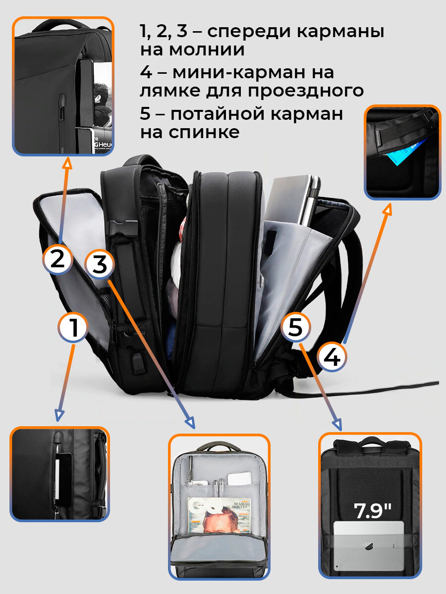 | Плюсы: | Сшит очень качественно: аккуратные ровные строчки, качественные материалы. Рюкзак очень вместительный- 17-идюймовый ноут потерялся в отделении для ПК, 19-идюймовый точно войдёт. Удобные регулирующиеся лямки и . Выход для подключения пауэрбанка для зарядк телефона. Внутренние отделения с множеством полезных приятных мелочей, таких как карабин для ключей, дополнительная сетка в среднем отделении и т.д. Удобно, что с ним можно путешествовать, превратив его в чемодан, по габаритам это "cabin" и его можно брать с собой в салон, не сдавая в багаж. |