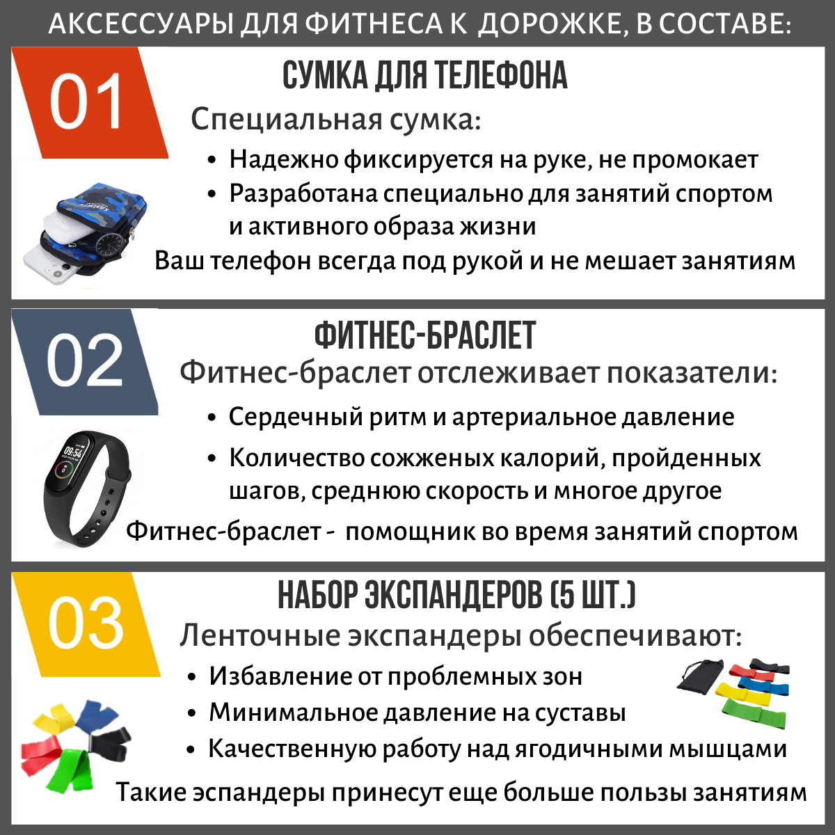 | Подробная комплектация | Беговая дорожка, смазка для бегового полотна (силиконовая, 1 шт), сумка для телефона с креплением на руку, защитный коврик и спортивная бутылка. |