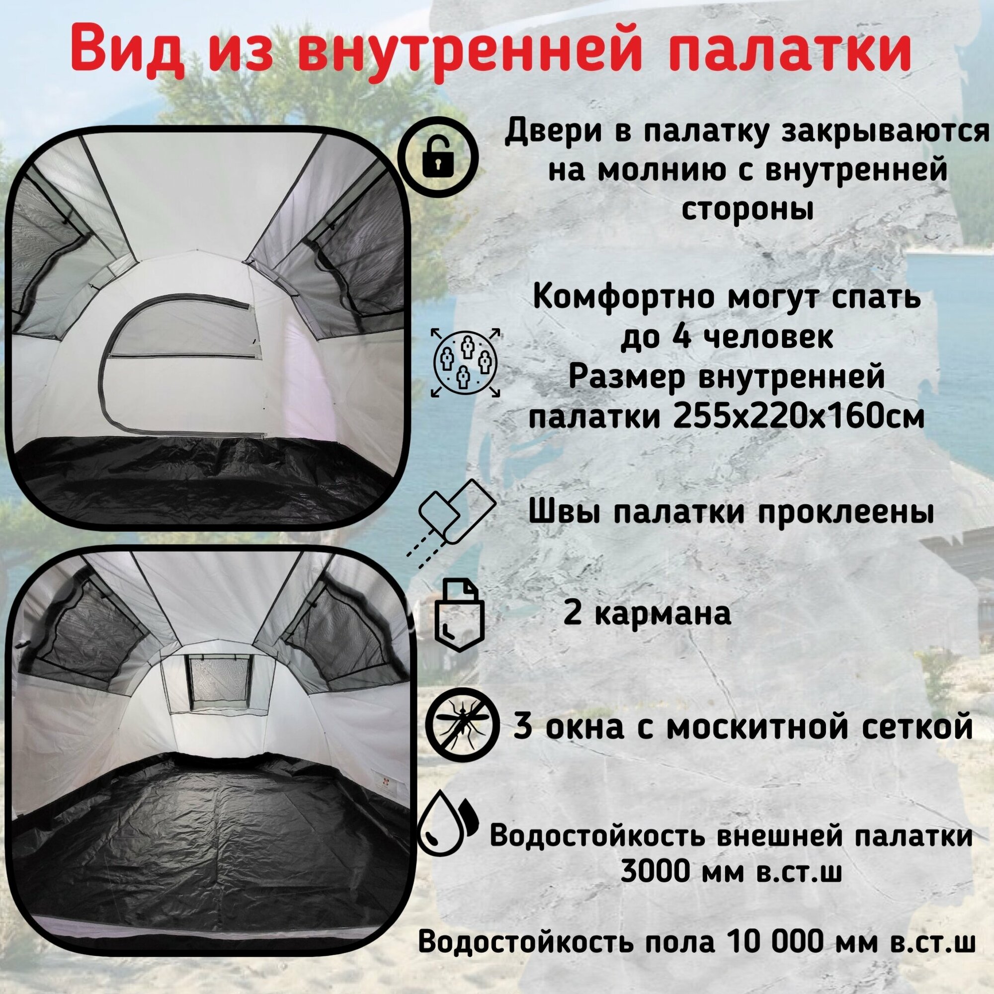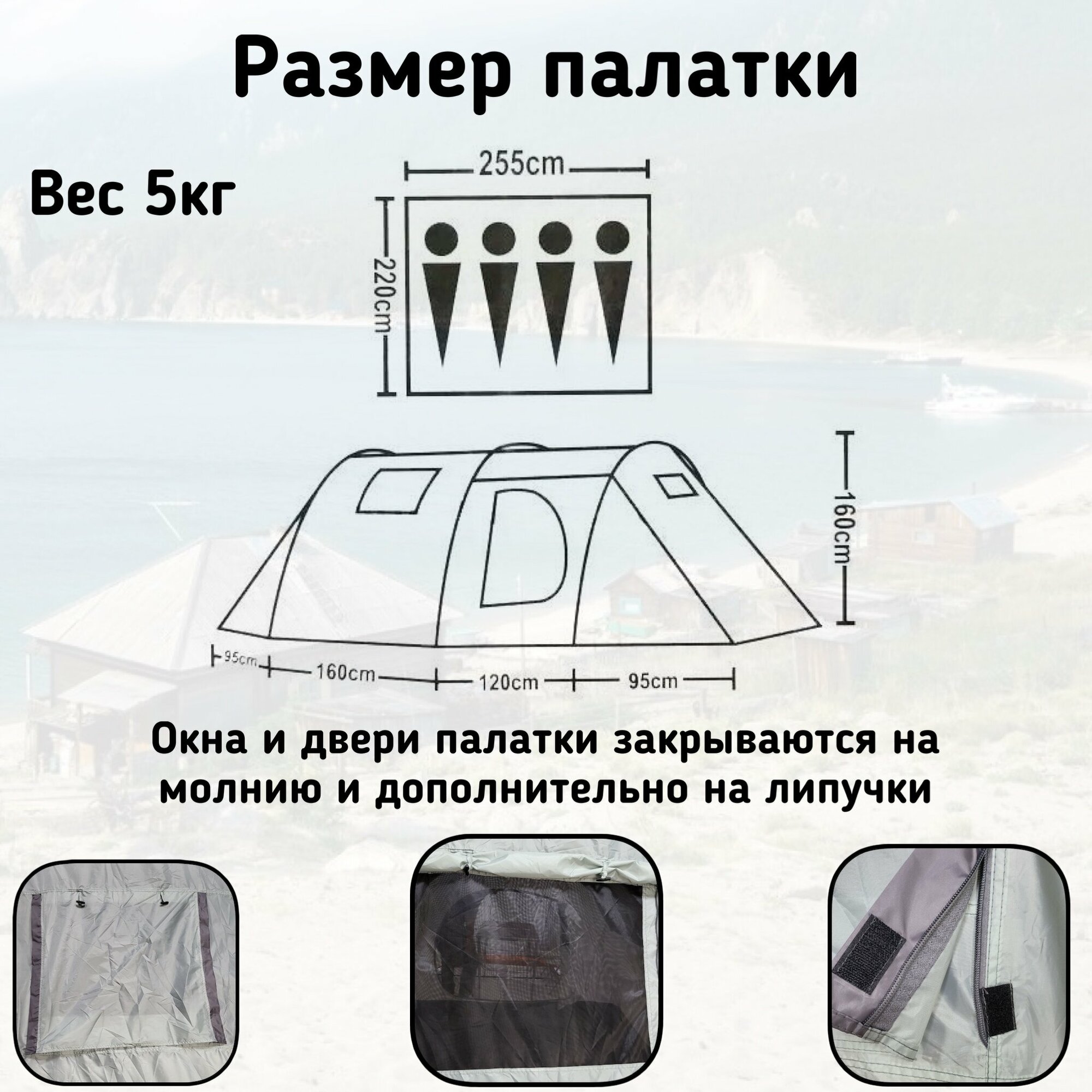 | Особенности | 2 комнаты / вентиляционные отверстия / внутренняя палатка / проклеенные швы / противомоскитная сетка / тамбур / штормовые оттяжки |