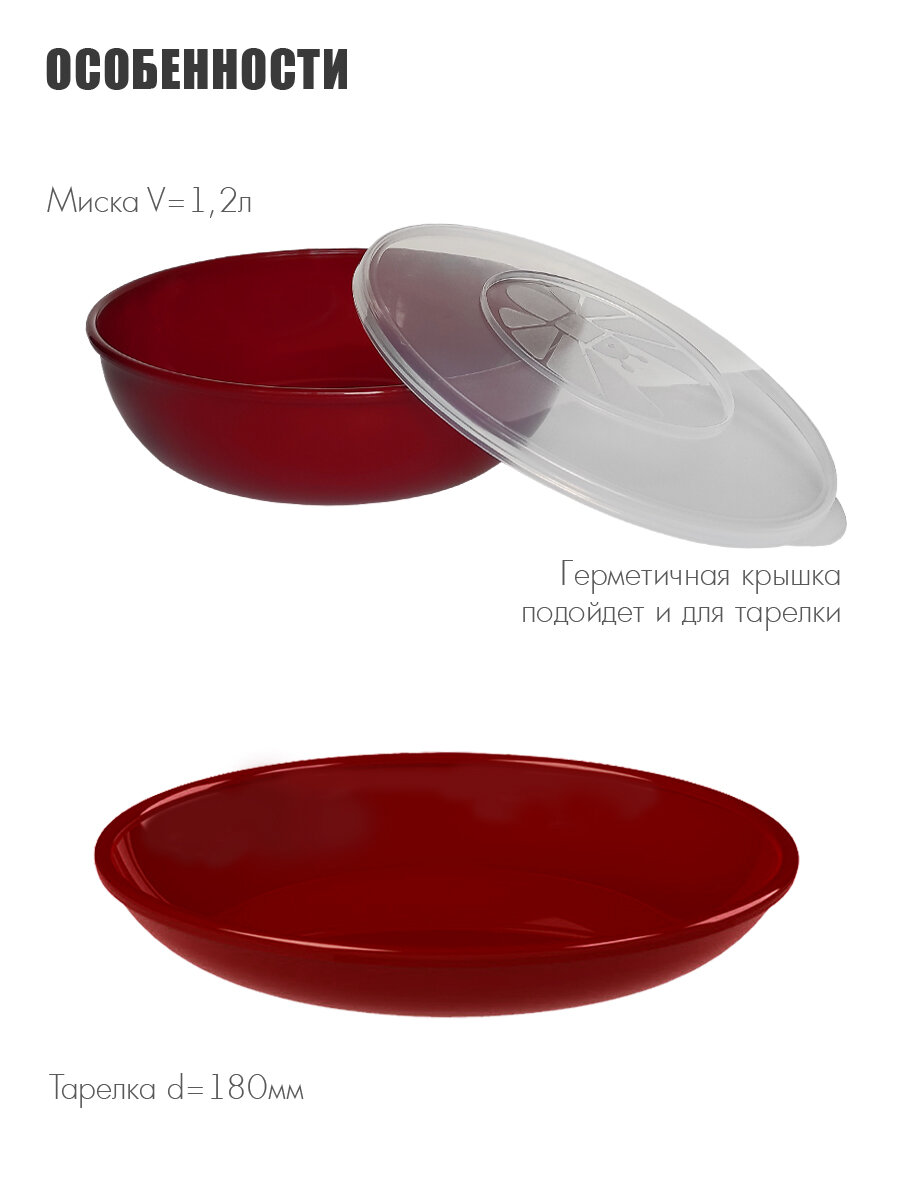 | Комплектация | 1 шт. - миска 1,2л с герметичной крышкой; 1 шт. - тарелка 180мм; 1 шт. - чашка 0,28л; 1 шт. - стакан 0,1л с мерными делениями; 1 шт. - вилка; 1 шт. - ложка столовая; 1 шт. - нож; 1 шт. - ложка чайная. |