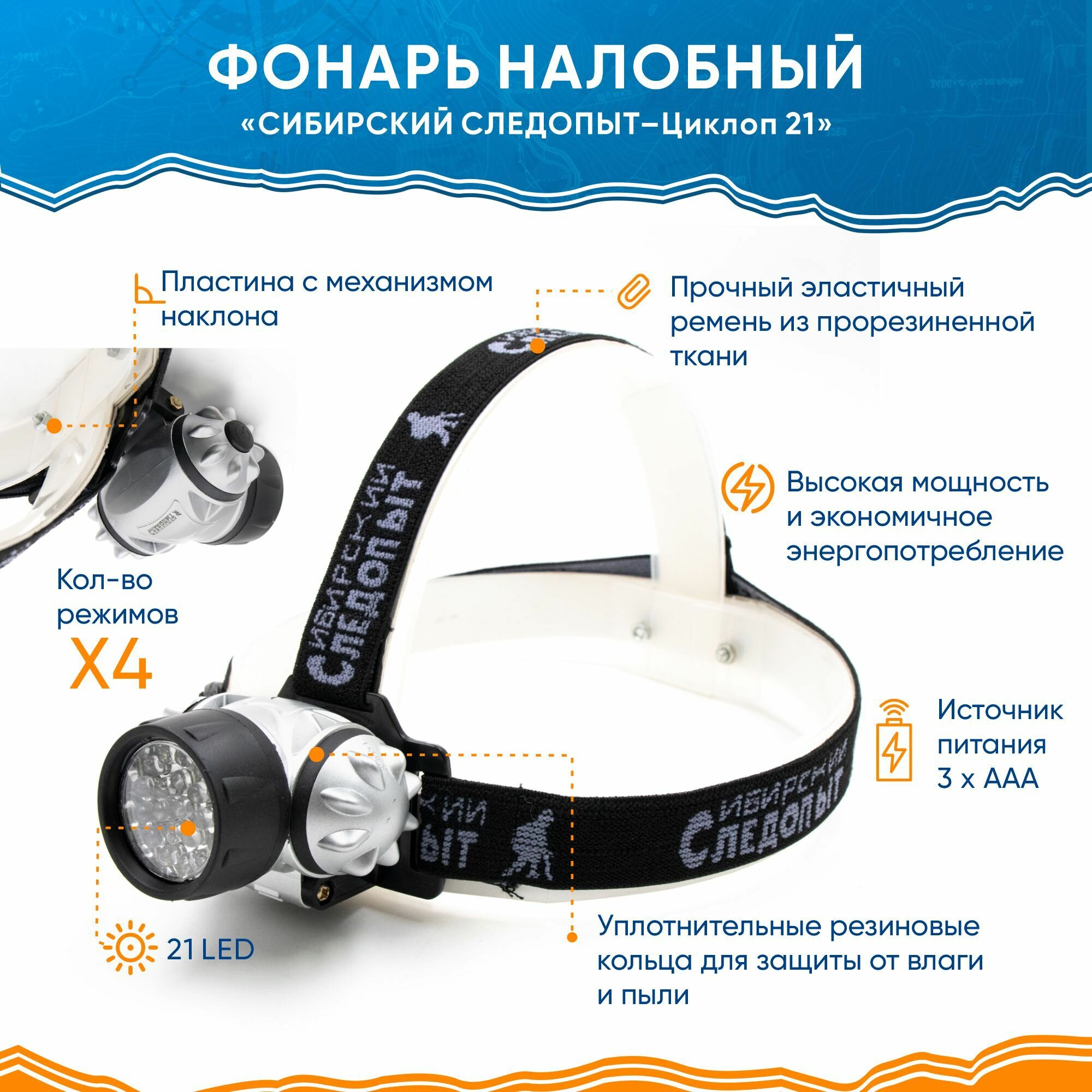 Фонарь налобный "сибирский следопыт-циклоп 21", 21L, 3хААА интересное: