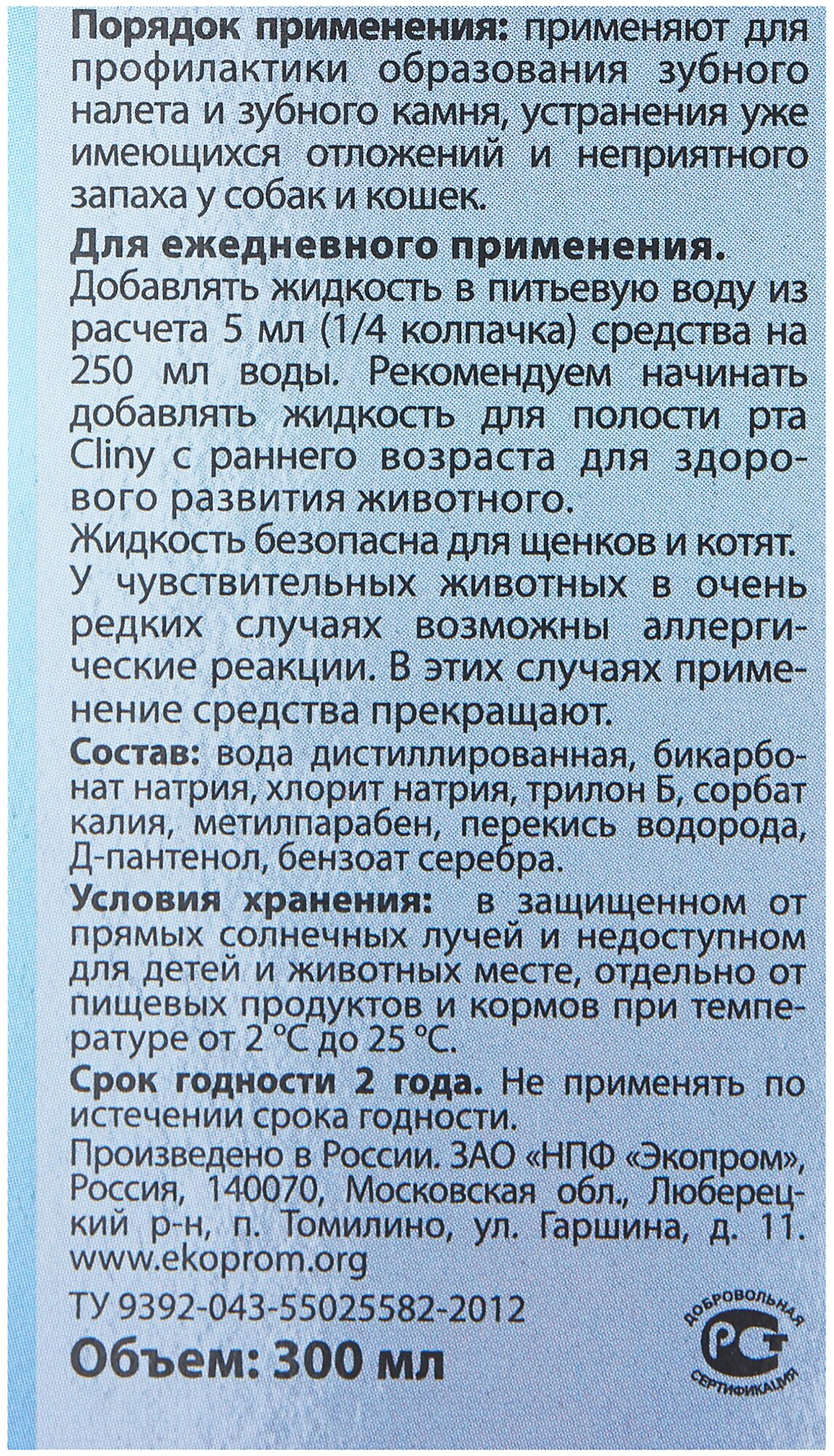 Жидкость для полости рта для кошек и собак, Экопром Cliny K102, 300мл