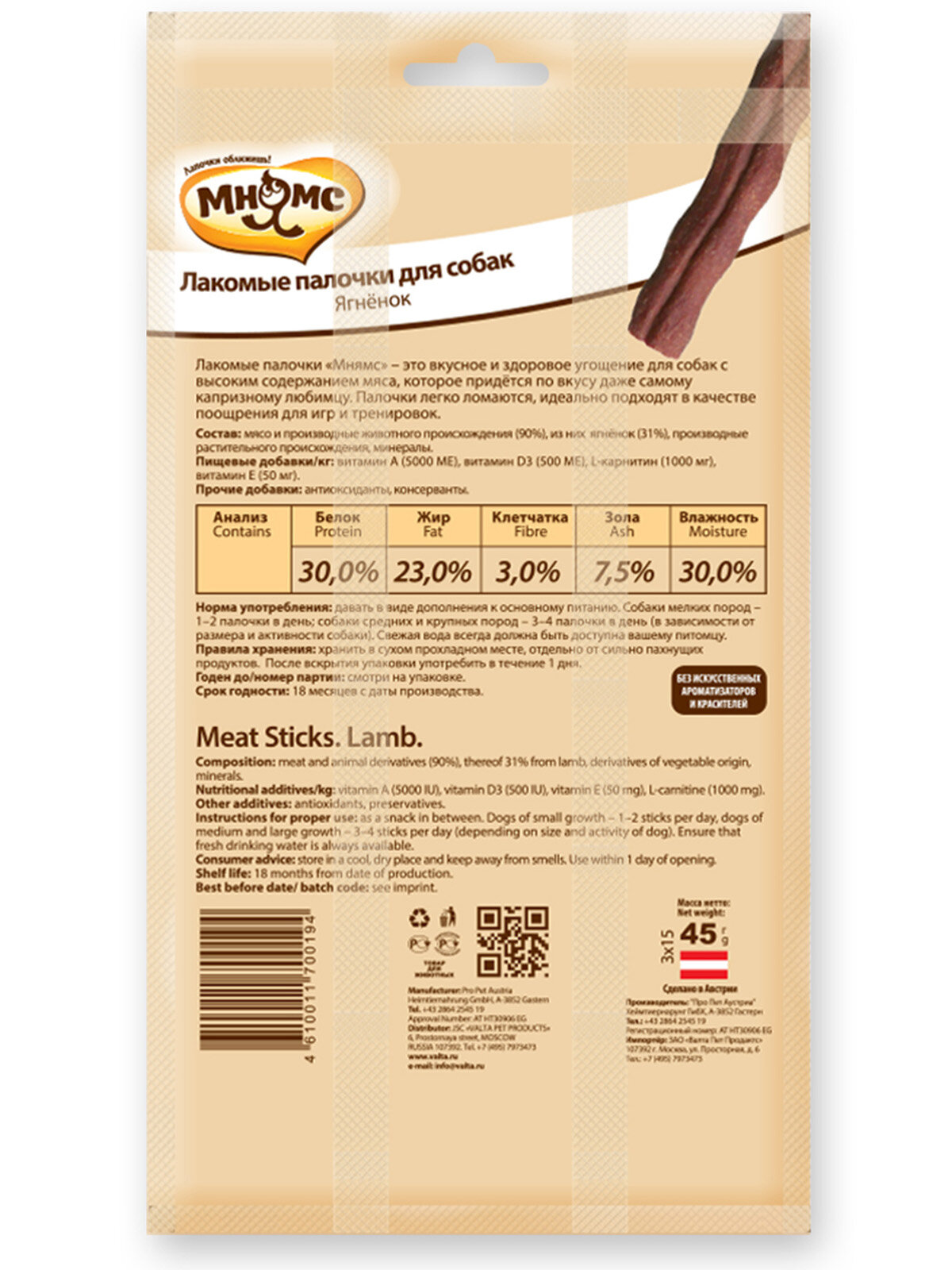 Мнямс лакомые палочки с ягненком для собак, 45 гр., 1 шт.