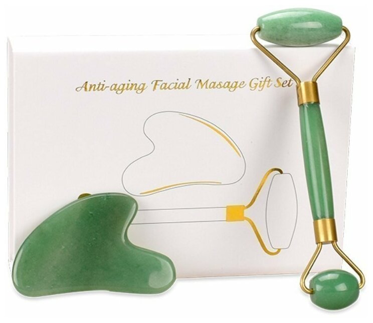 Скребок гуаша для лица, тела / набор роллер массажер, пластина / Зеленый кварц / Аметист/ Нефрит