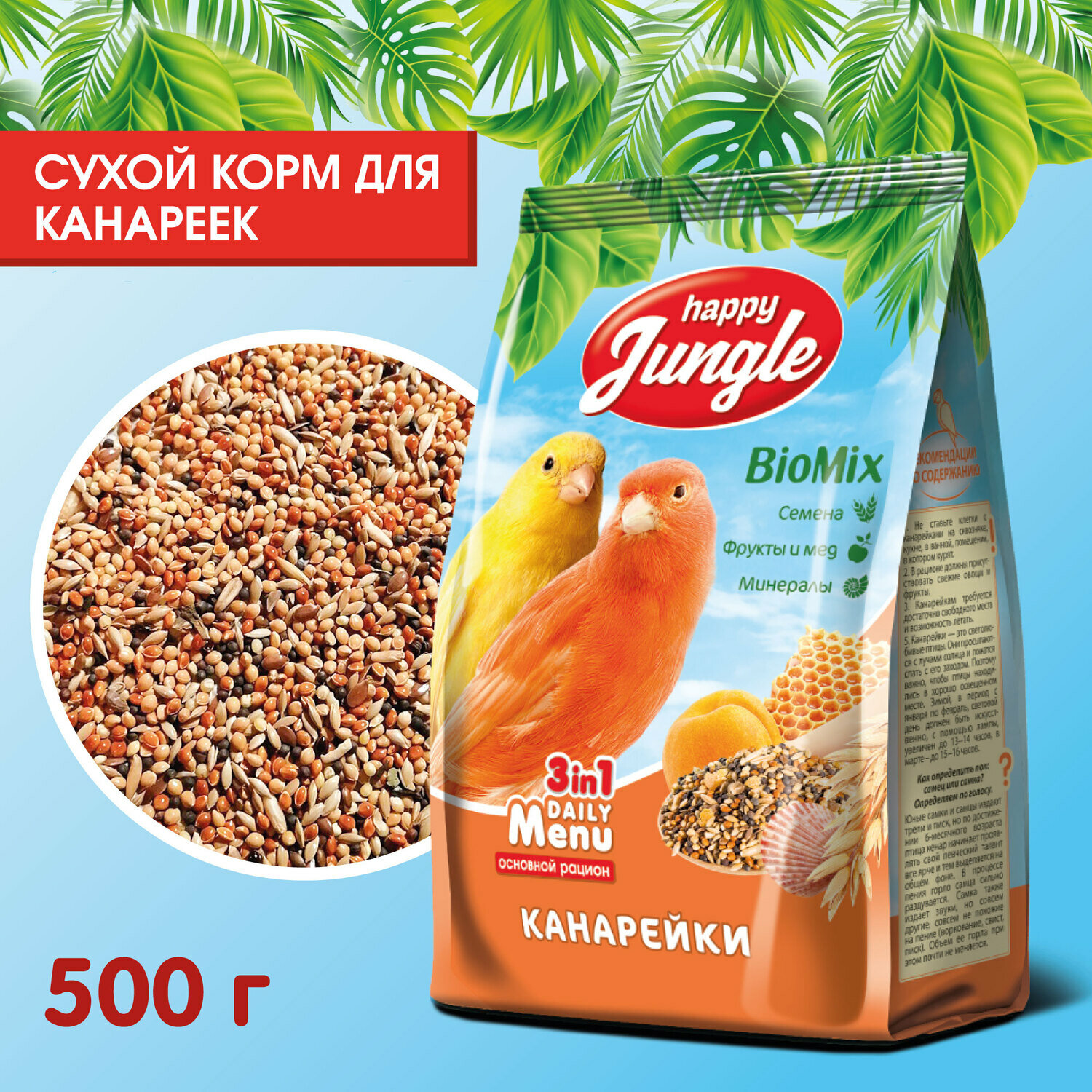 Корм для птиц сухой Happy Jungle / Хэппи Джангл BioMix Daily Menu основной рацион для канареек из проса и овса 500г / зерновая смесь