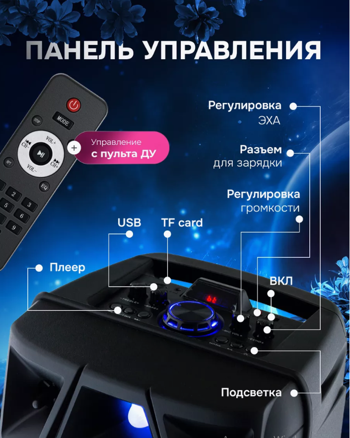 | Плюсы: | большой размер, достаточно громкая, в комплекте пульт и микрофон (микрофон не опробовал) Яркая, переключающаяся подцветка, 3 режима. Радио более - менее ловит. В режиме "Радио" подцветка выключается. |