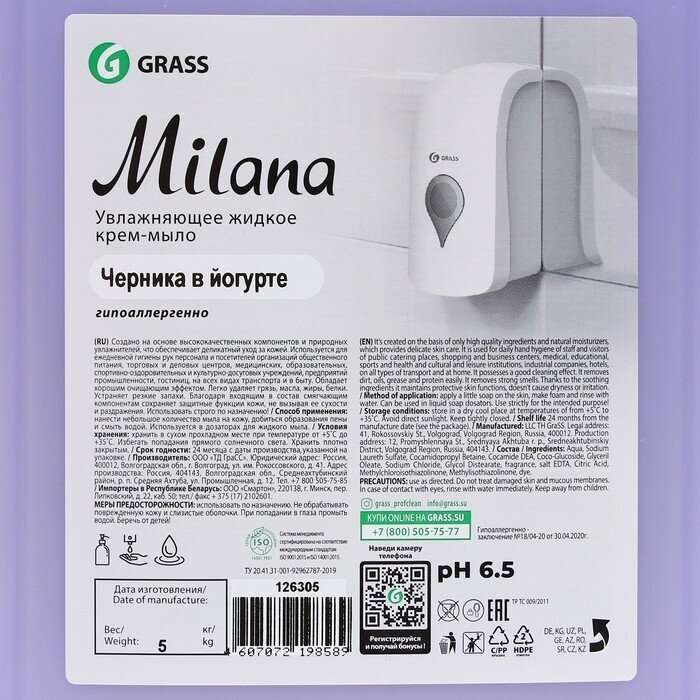 GRASS 126305 Мыло жидкое для рук grass milana (черника в йогурте), 5кг.