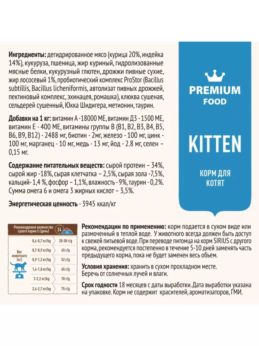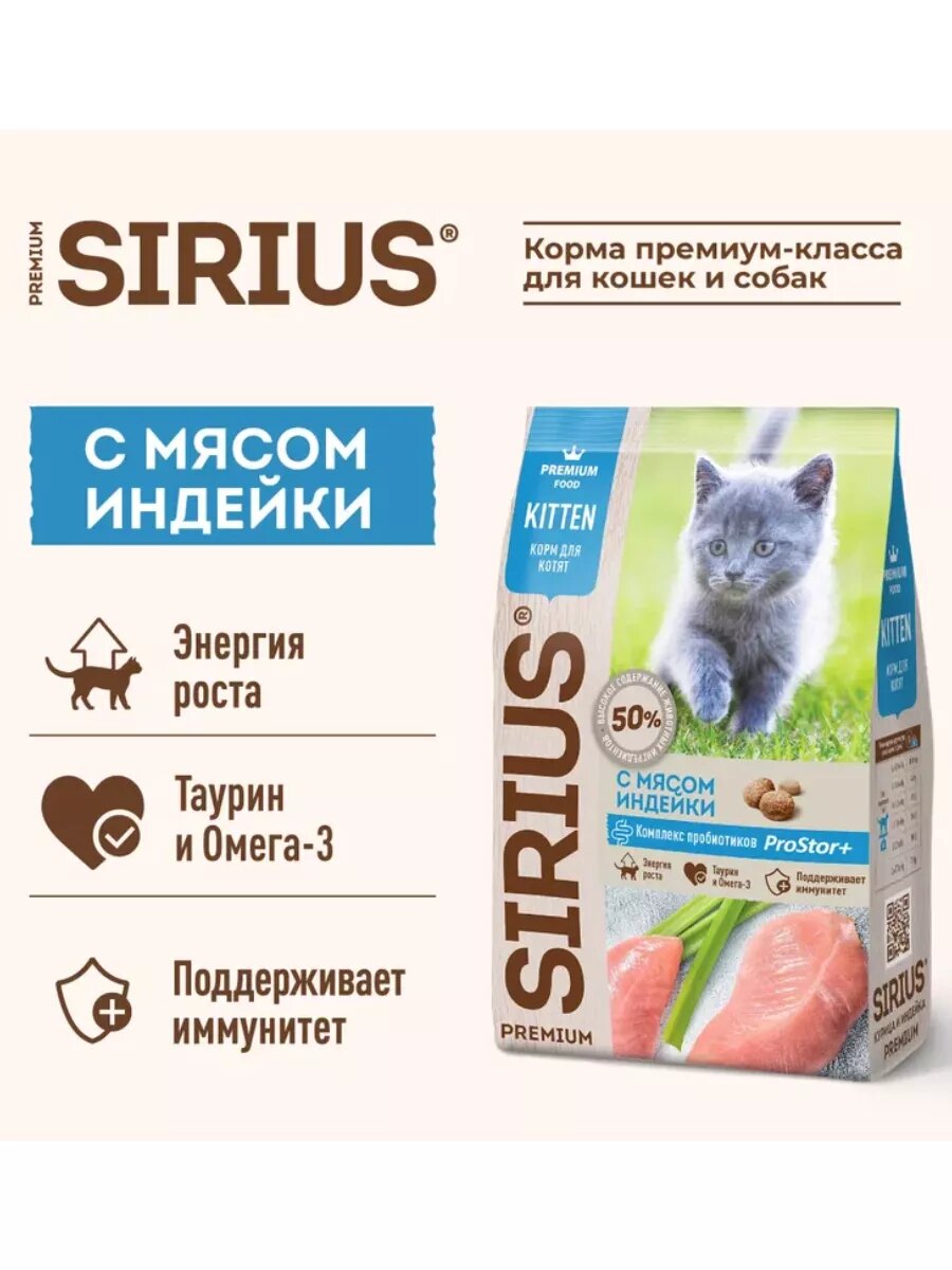 Sirius Сириус сухой полнорационный корм корм для котят с мясом Индейки 1,5кг