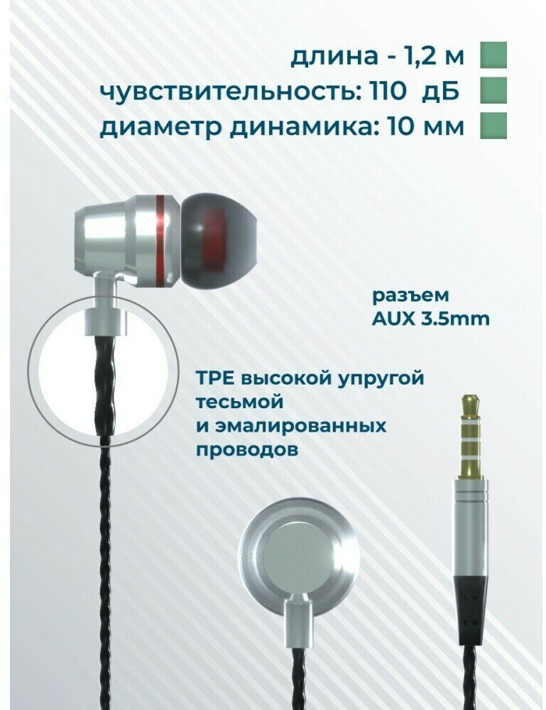 Наушники More Choice P71 вакуумные AUX разъём с МК и рег.громкости длина 1.2м серебряный