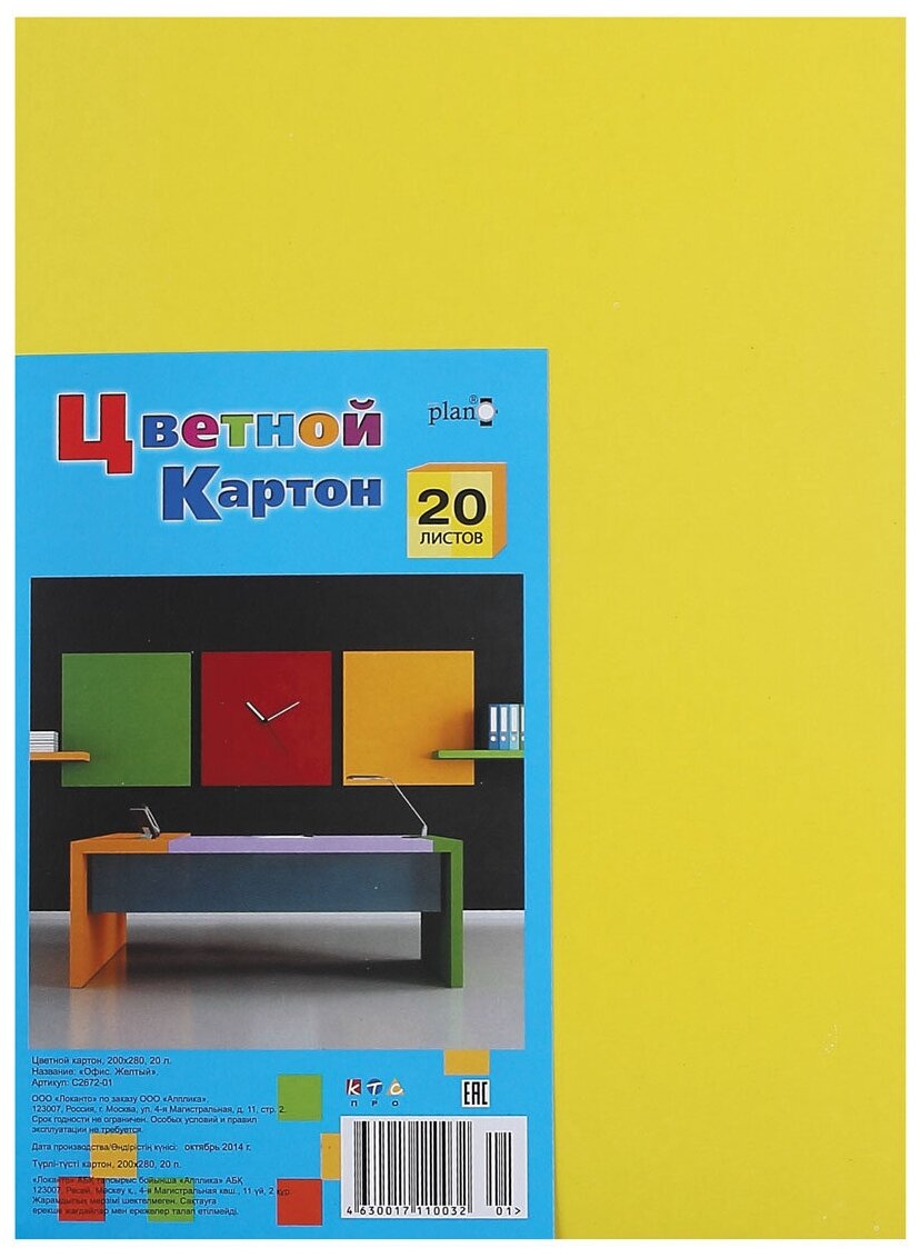 Купить Набор цветного картона Офис Желтый А4, 20 листов, 1 цвет, немелованный, без скрепления Апплика С2672-01 - 1 шт.