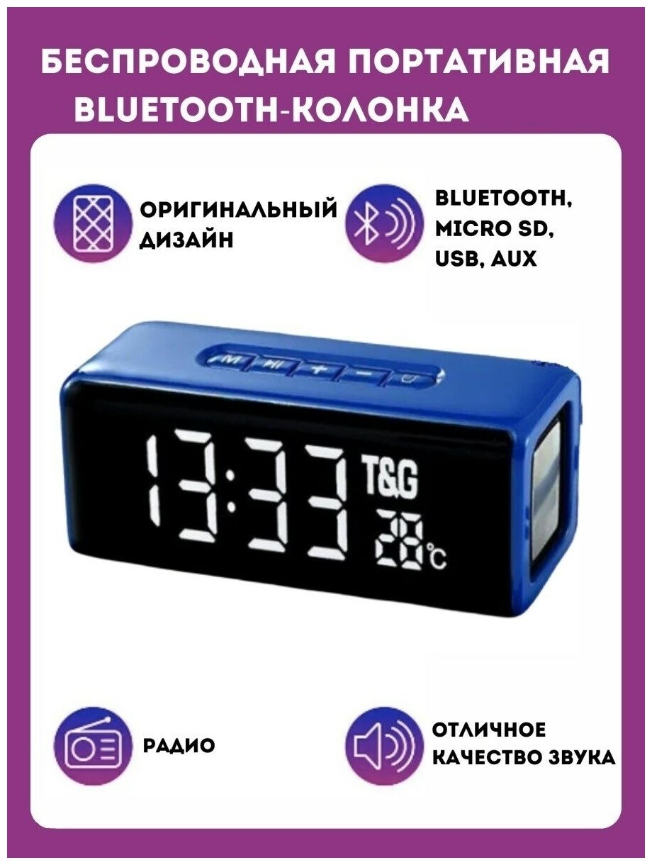 Купить Портативная колонка, блютуз колонка с часами и будильником / USB / MicroSD / Ipod, Iphone, Android TG, Синий