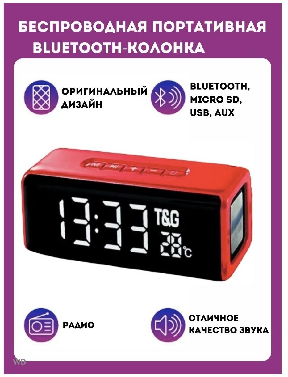 Портативная колонка, блютуз колонка с часами и будильником / USB / MicroSD / Ipod, Iphone, Android TG, Красный интересное: