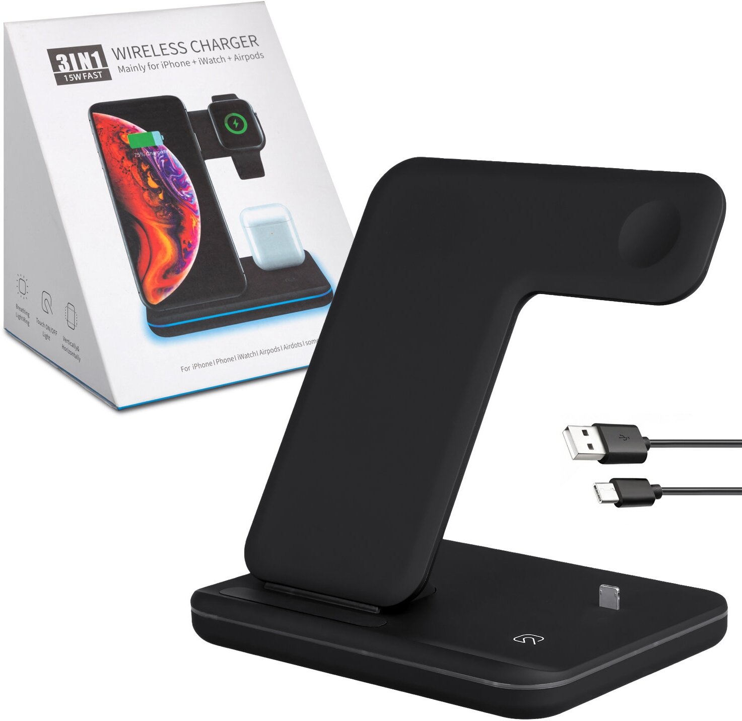 Купить Беспроводное зарядное устройство 3 в 1 для телефонов iPhone, Samsung, часов Apple Watch, наушников AirPods / Быстрая зарядка / Док-станция / Черная