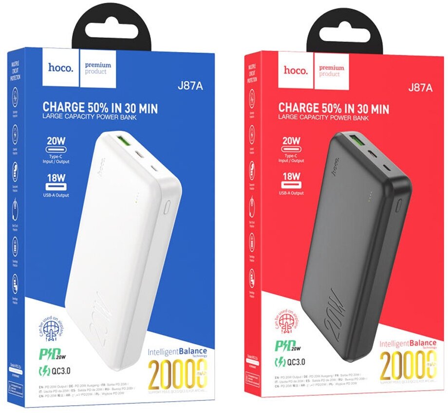 Универсальный Доп. Аккумулятор 10000mAh, J87, HOCO, выход 1 USB (18W), 1 PD (20W), вход Micro/Type-C, белый