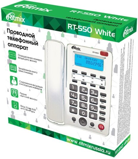 RITMIX Проводной телефон Ritmix RT-550, дисплей, телефонная книга, однокнопочный набор, AUX, белый