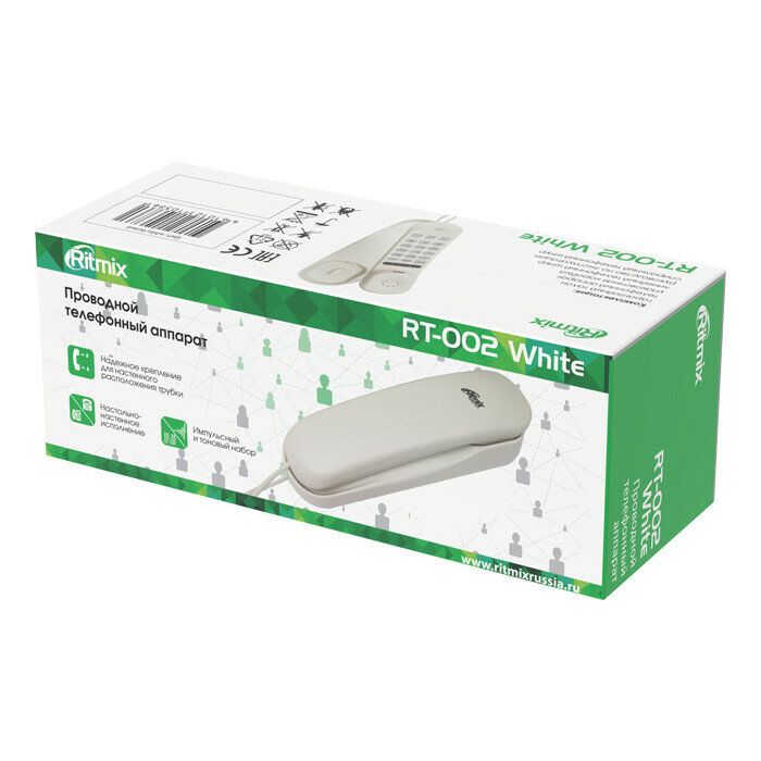 Телефон RITMIX RT-002 white, удержание звонка, тональный/импульсный режим, повтор, белый, 80002230, 263157