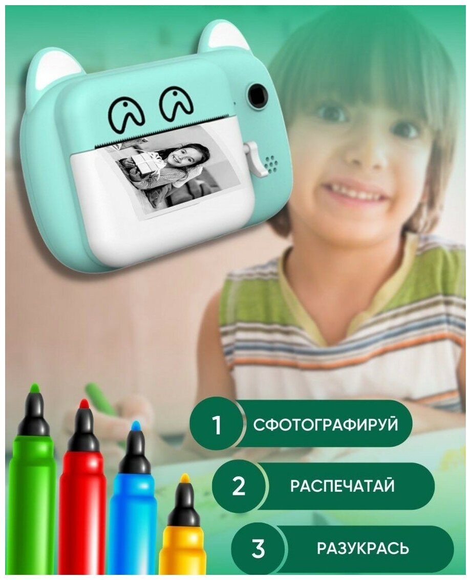 Детский фотоаппарат с мгновенной печатью фото Print Camera Котенок+CD карта 32GB (бирюзово/белый)