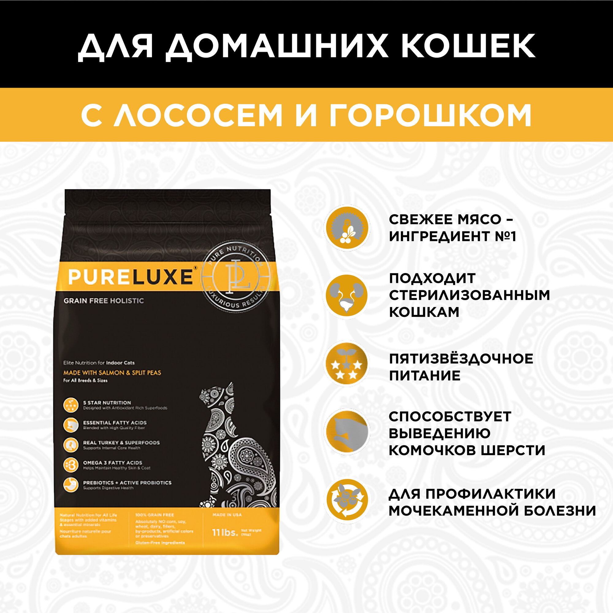 Корм сухой PureLuxe для домашних кошек с лососем и горошком, 5 кг