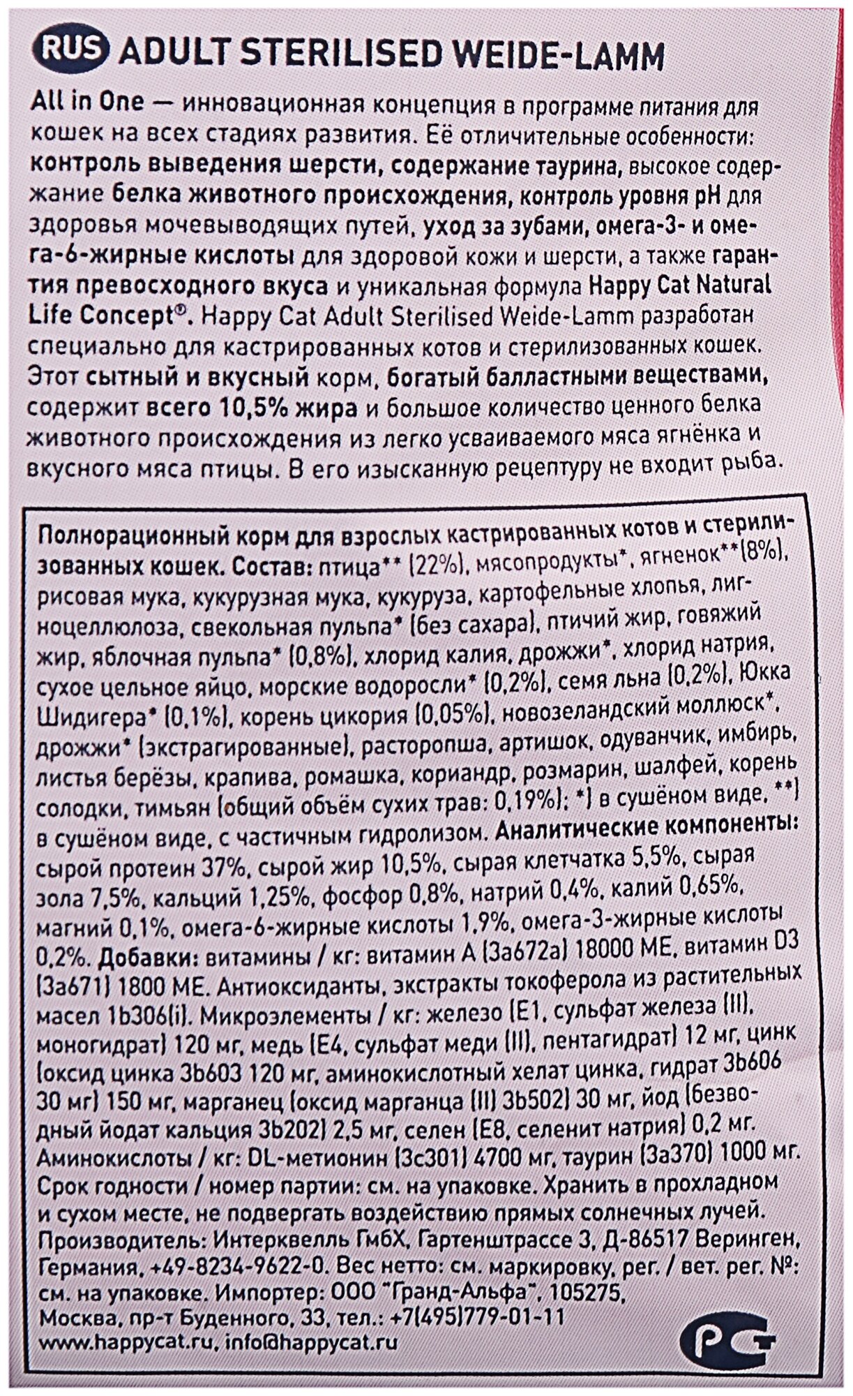 Happy Cat Supreme Adult Sterilised корм для стерилизованных кошек Ягненок, 10 кг. интересное: