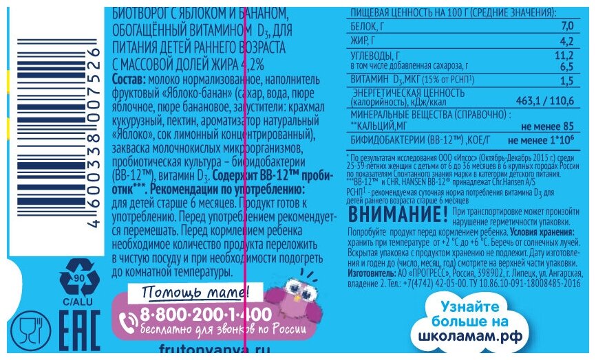 Ниже Вы можете прочитать отзывы на Биотворог ФрутоНяня, с яблоком и бананом 4,2%, 100 г, ознакомится с подробными характеристиками, посмотреть интересные обзоры и фотографии на Биотворог ФрутоНяня, с яблоком и бананом 4,2%, 100 г.