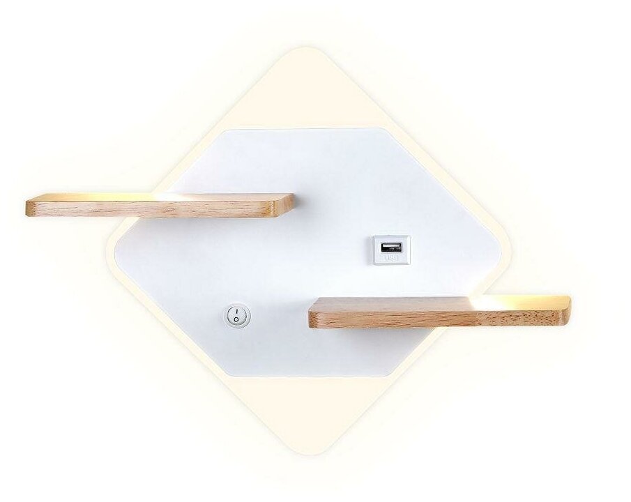 Настенный светодиодный светильник с выключателем, USB и полкой FW100 WH/WD белое/дерево LED 3000K/4200K/6400K 12W 340*250*105
