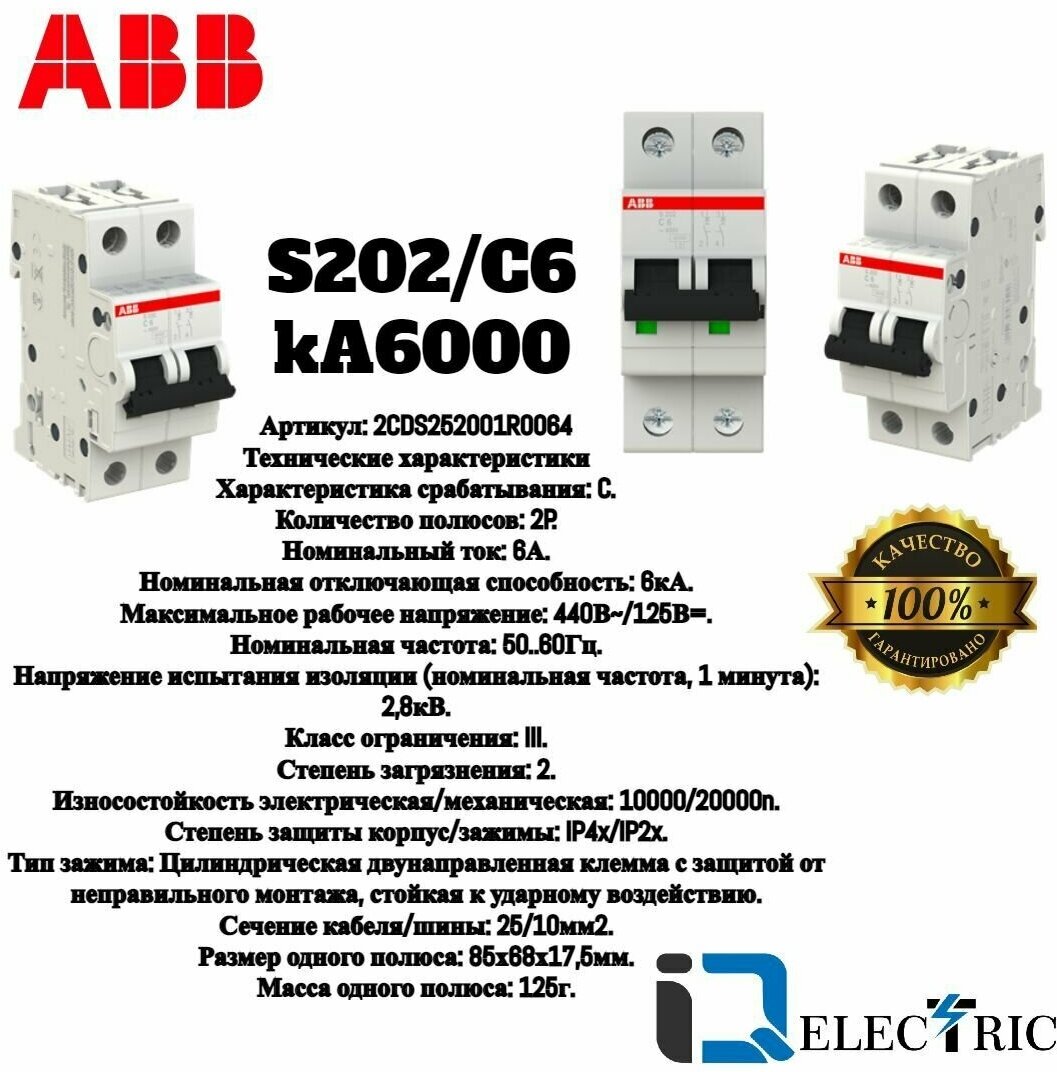 Автоматический выключатель 2P (2П) 6А тип C 6кА S202 ABB 2CDS252001R0064 3шт
