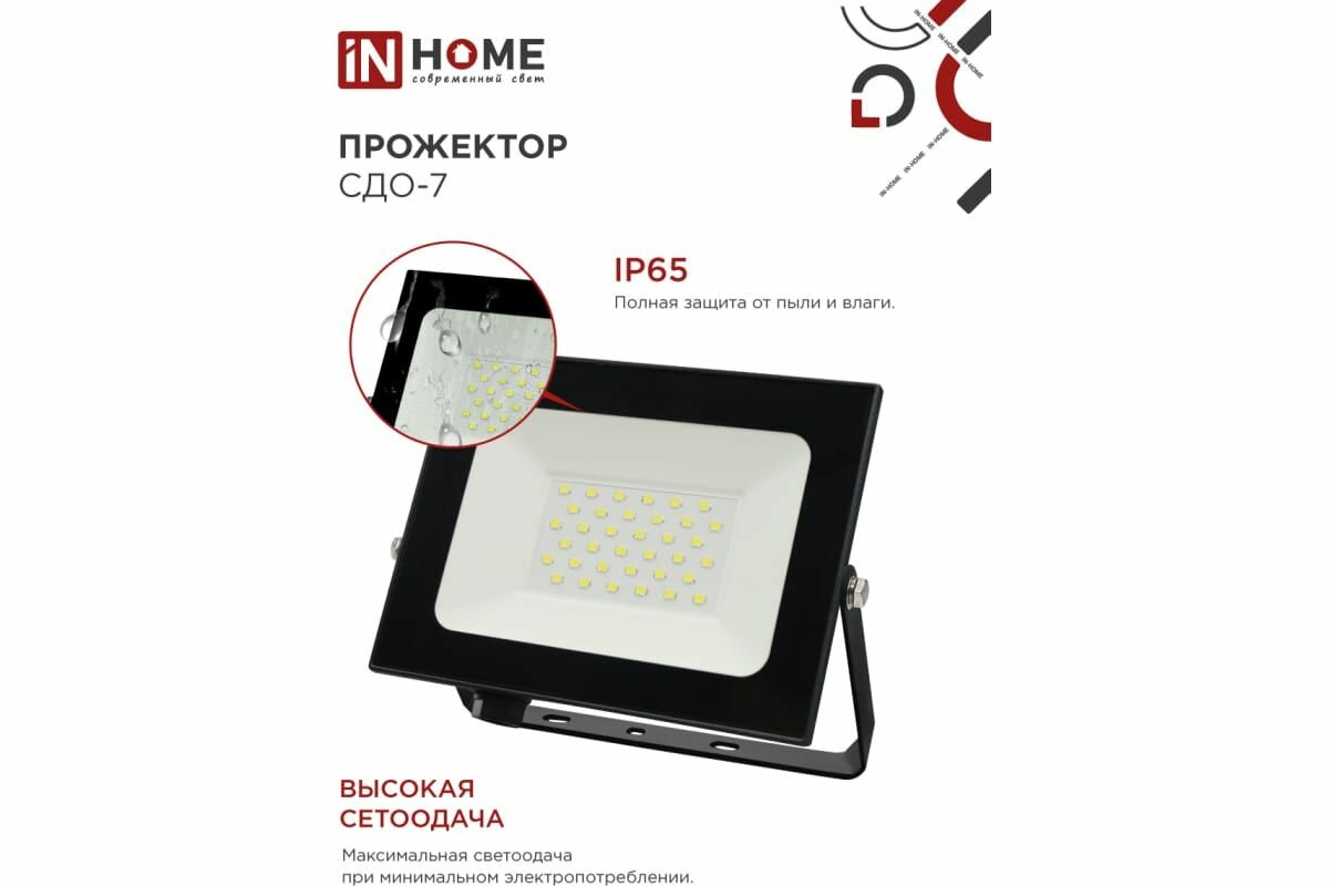 Прожектор светодиодный IN HOME СДО-7, 100 Вт, 230 В, 6500 К, IP 65, черный
