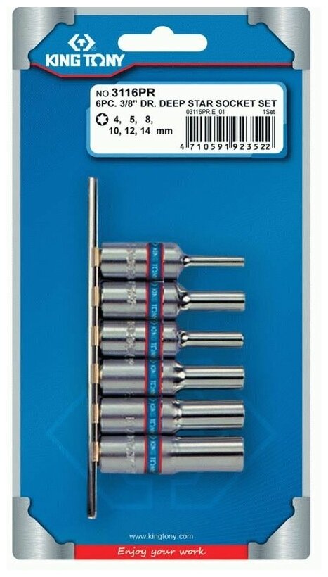 Купить Набор глубоких торцевых головок 3/8", TORX Е-стандарт, E4-E14, 6 предметов KING TONY 3116PR