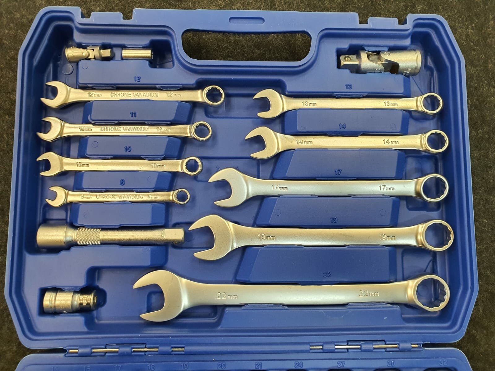 | Плюсы: | Хороший ассортимент головок и ключей. Множество переходников и "карданов". Металлические застёжки кейса. |