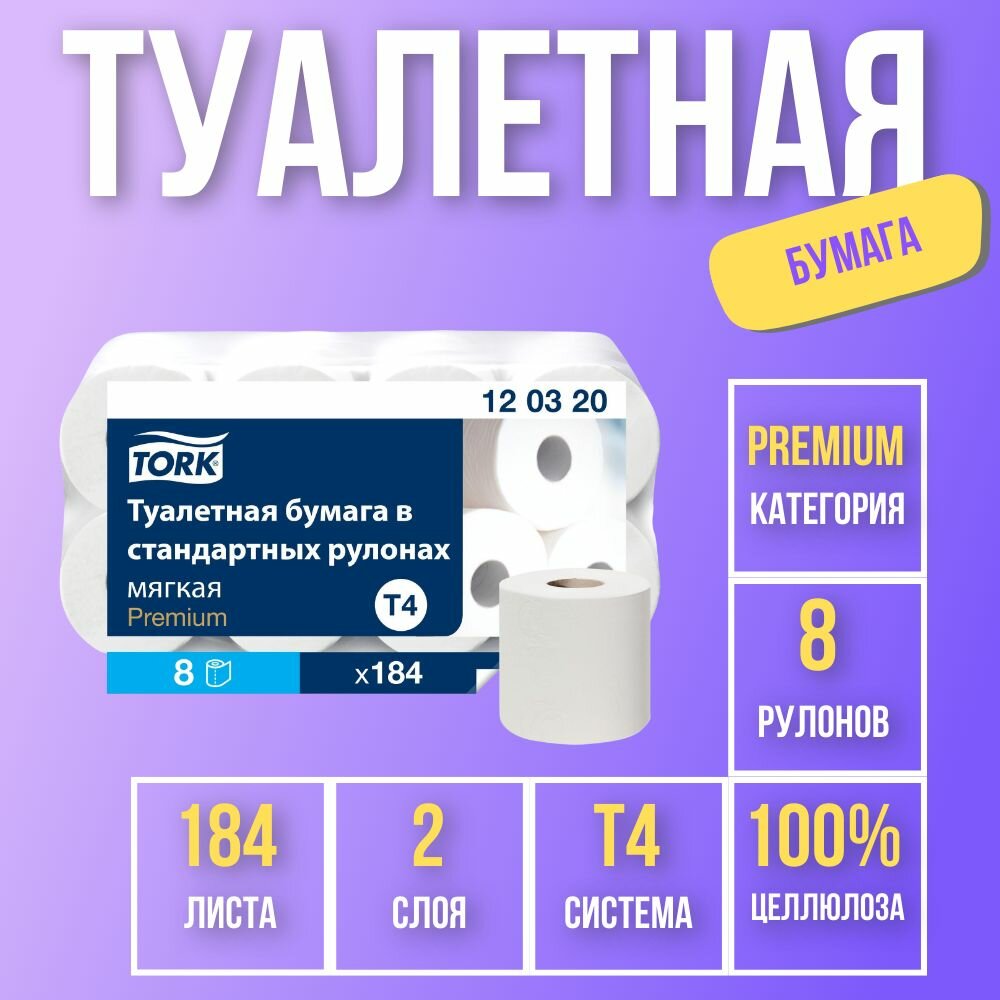 Tork туалетная бумага в стандартных рулонах, система Т4, туалетная бумага белого цвета, двухслойная, уровень качества - Премиум, состоит из 100 %-й целлюлозы, в рулоне 184 листа, размеры листа в рулоне 23 м х 95 мм., в упаковке 8 рулонов. (120320)