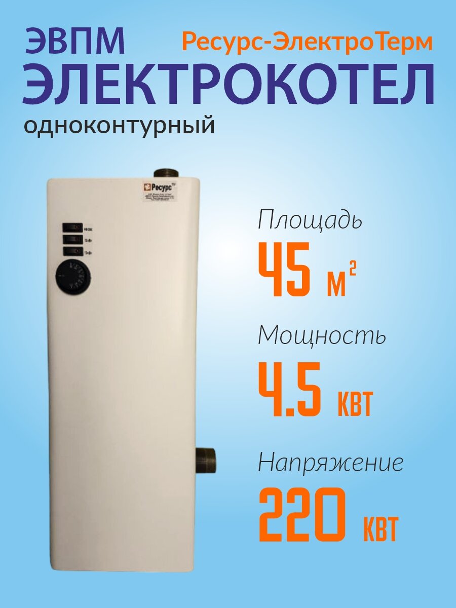 Ниже Вы можете прочитать отзывы на Электрический котел Ресурс ЭВПМ - 4.5, ознакомится с подробными характеристиками, посмотреть интересные обзоры и фотографии на Электрический котел Ресурс ЭВПМ - 4.5.