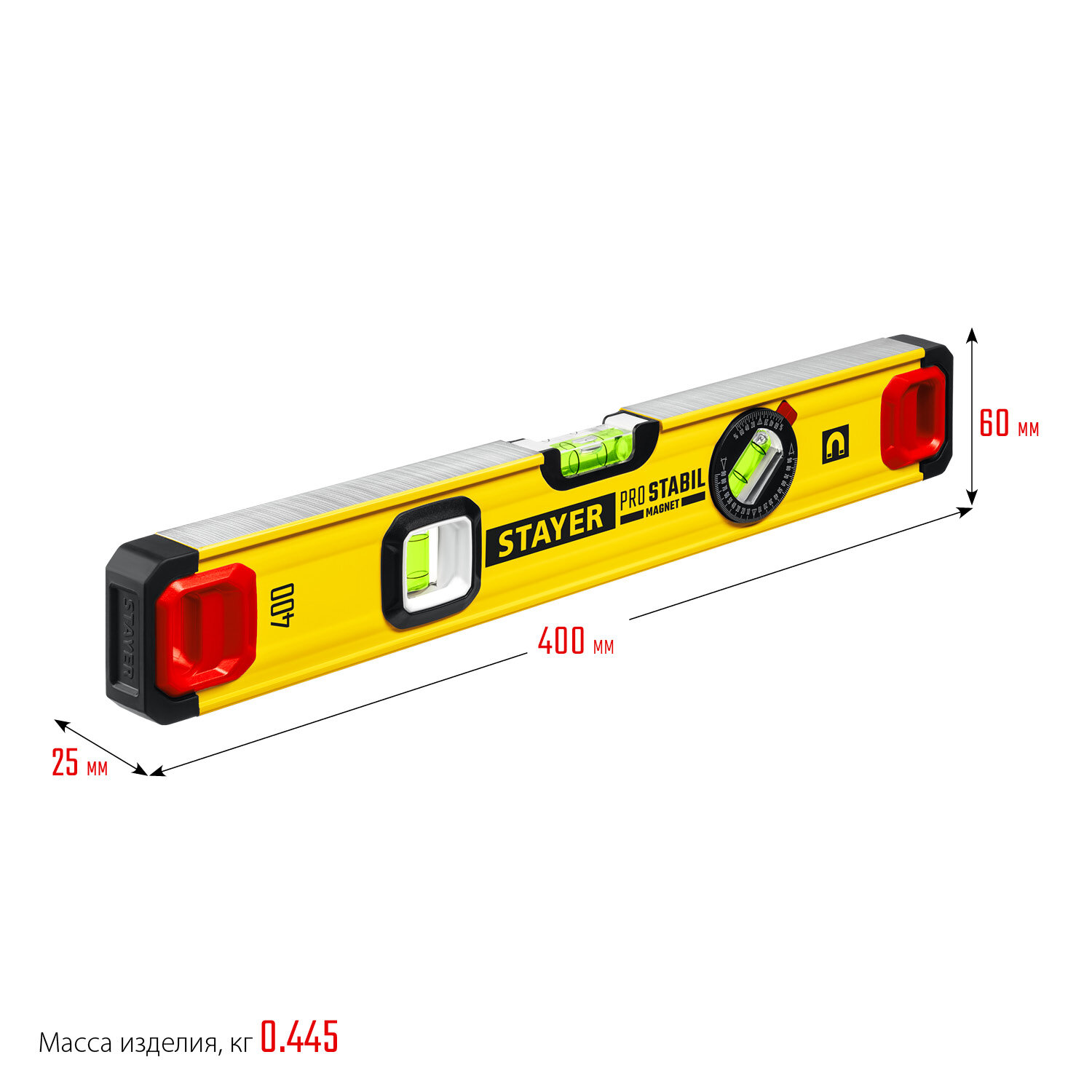 Уровень магнитный PRO STABIL MAGNET STAYER 400 мм, 3 глазка, точность 0.5 мм/м