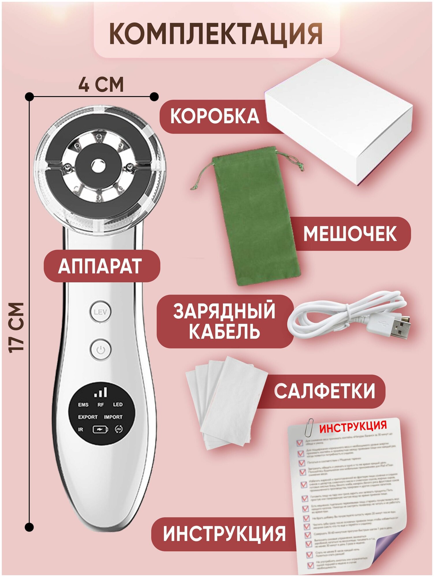 | Принцип работы | инфракрасное излучение / микротоки / RF-лифтинг / вибрация / фонофорез / светотерапия / пилинг |
