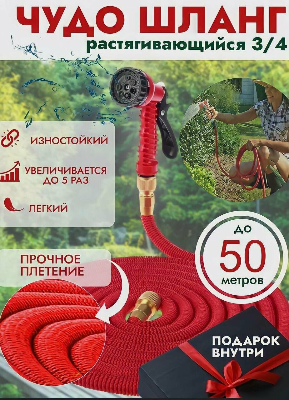 Шланг садовый растягивающийся 50 метров, с распылителем 7 режимов, PREMIUM качество, с металлическим соединением 3/4, для полива, красный, шланг дачный