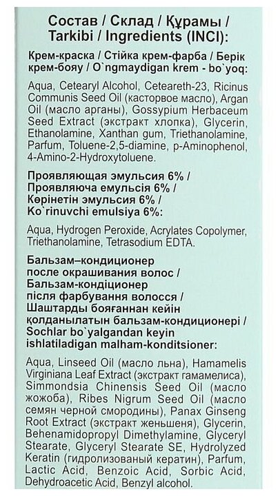 | Плюсы: | Без аммиака, не сжигает волосы. Отличная уходовая косметика для волос. |