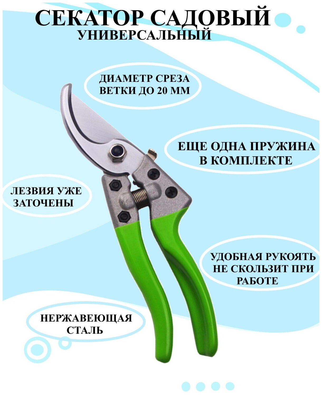 Секатор садовый с салатовой ручкой 19 см, универсальный секатор 20 мм срез, секатор для веток и кустарников интересное: