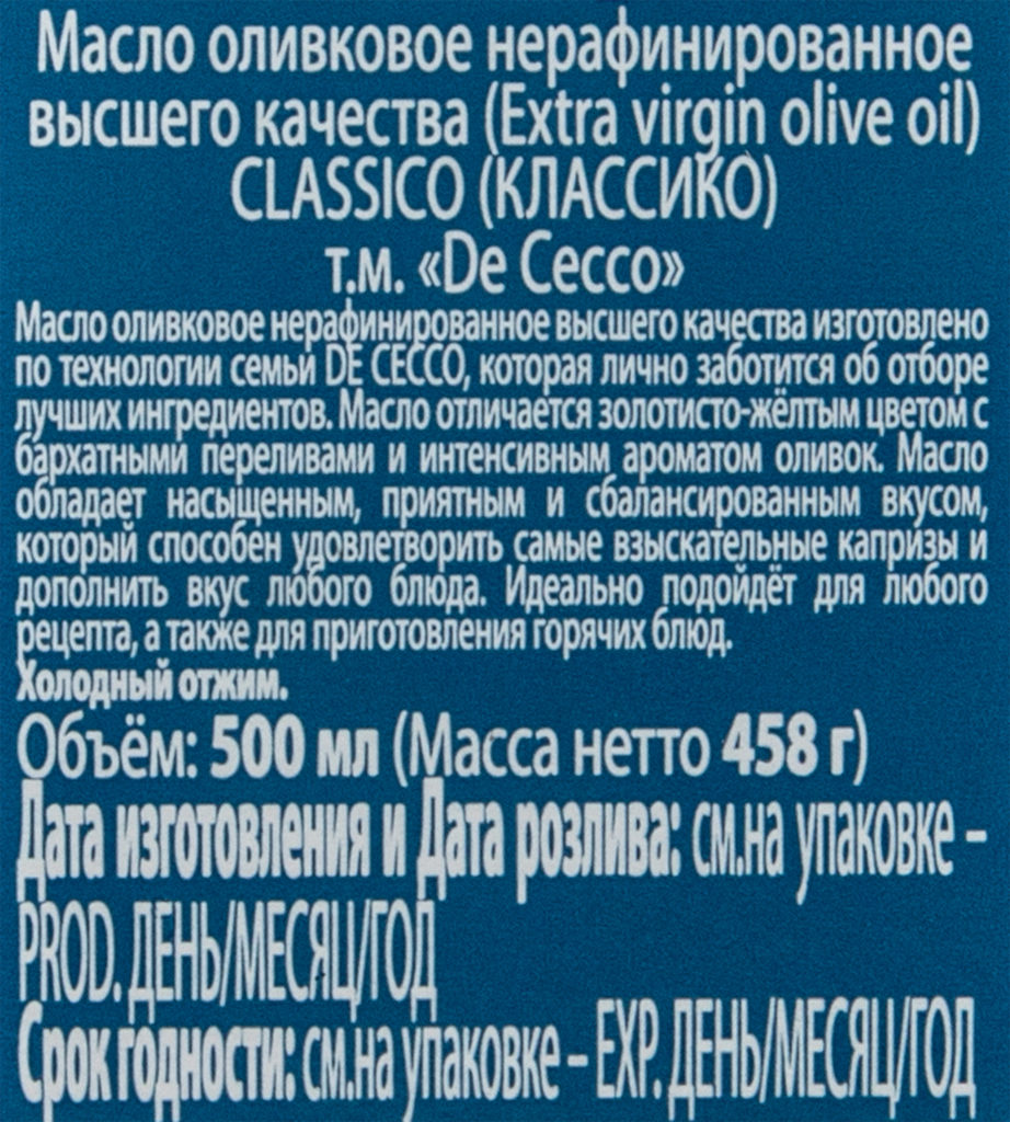 Масло оливковое DE CECCO Classico нерафинированное, 500мл