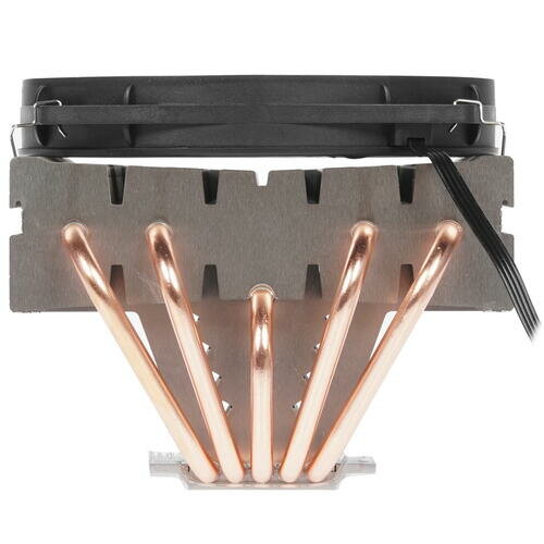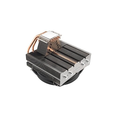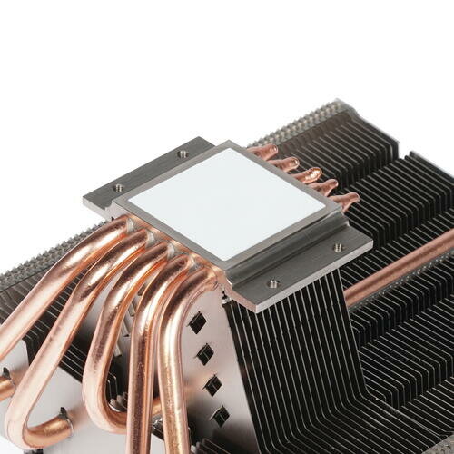 На максимальной скорости вентилятор почти не слышно, абсолютно нет вибрации. Оребрение непосредственно контактирует с площадкой процессора, в результате его типичная температура значительно ниже и не скачет резко при нагрузке, как при креплении только через тепловые трубки. Конструктивно обдувает прилегающие к процессору зоны. Подходит для солидного разгона: если поставить кулер пошумнее, можно удвоить TDP. |