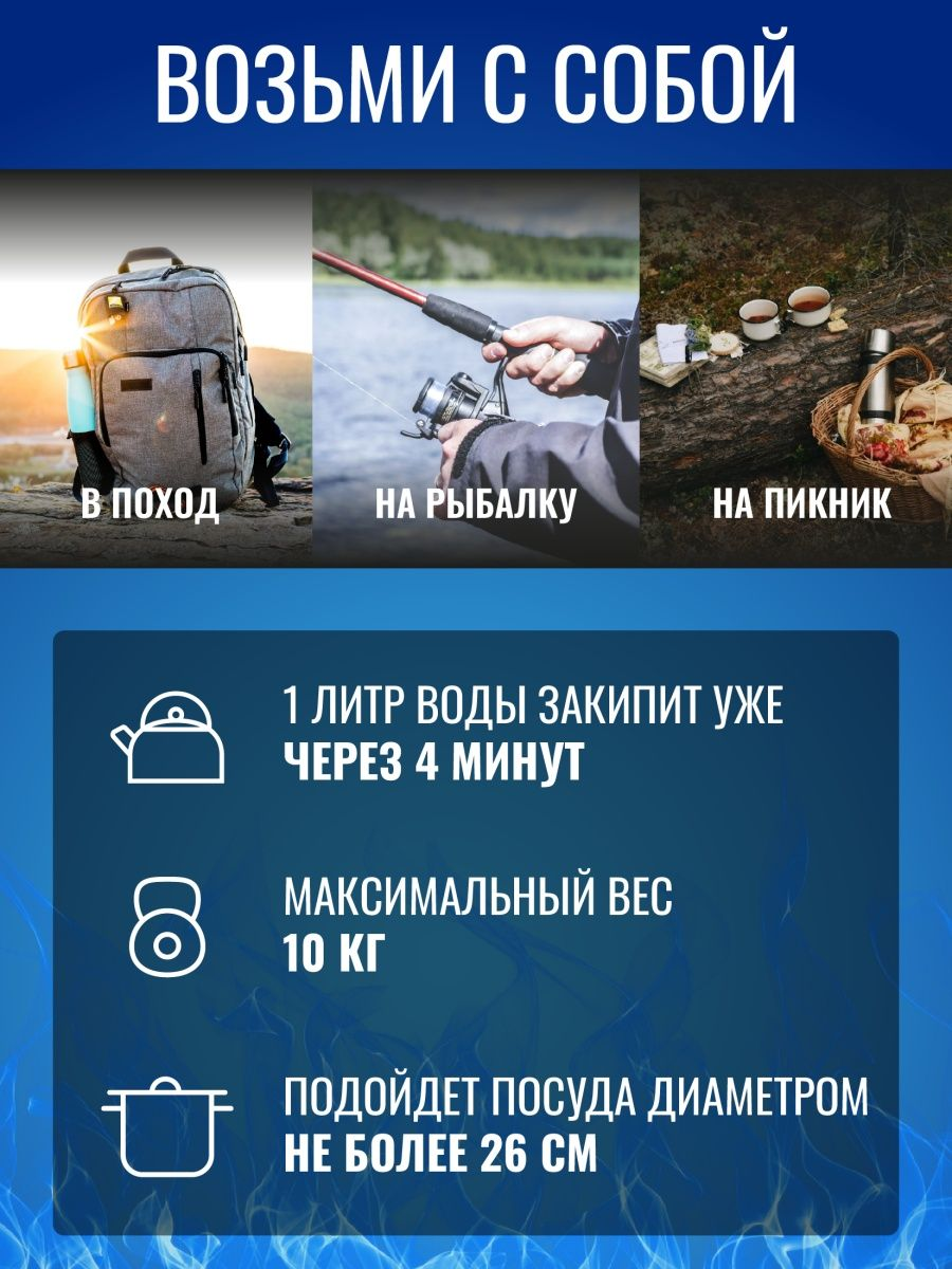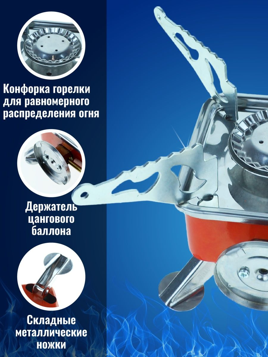 | Особенности конструкции | пьезоподжиг, регулятор уровня пламени, складная конструкция, цанговое подключение баллона |
