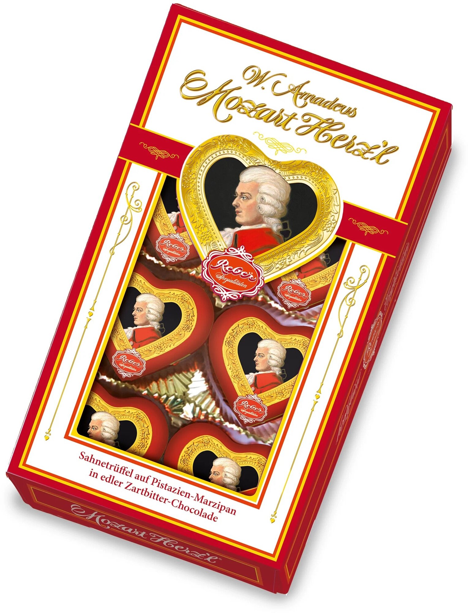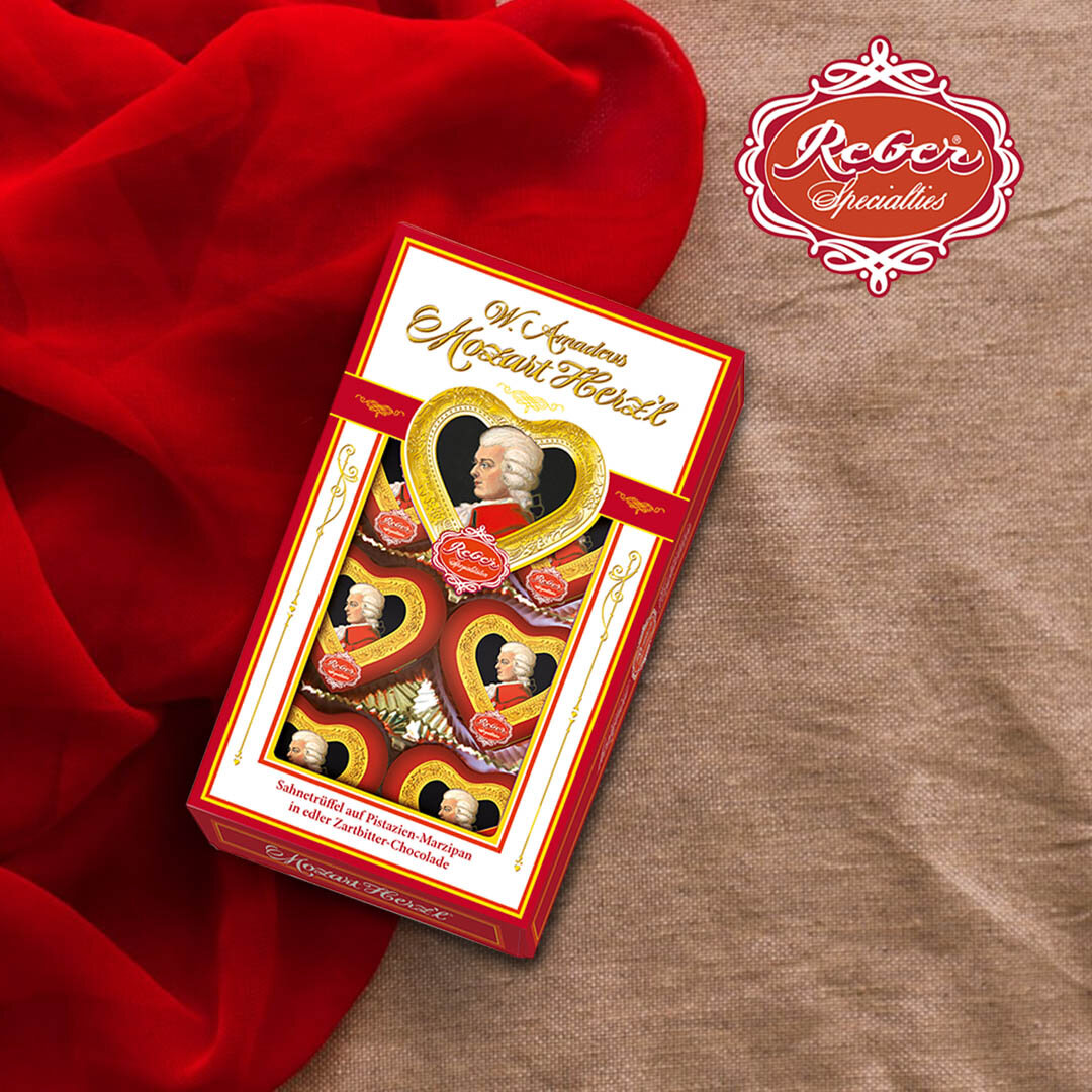 Подарочный набор Reber Mozart Шоколадные конфеты из горького шоколада сердечки, 80г