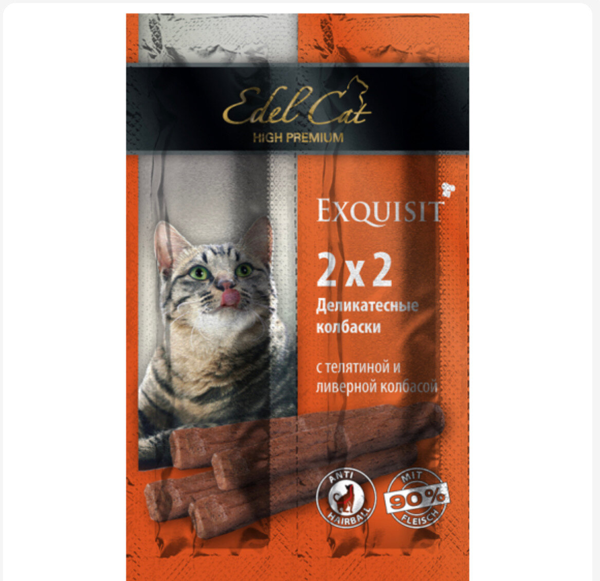 Edel cat лакомство деликатесные колбаски Телятина и ливерная колбаса, упаковка 4шт по 2гр