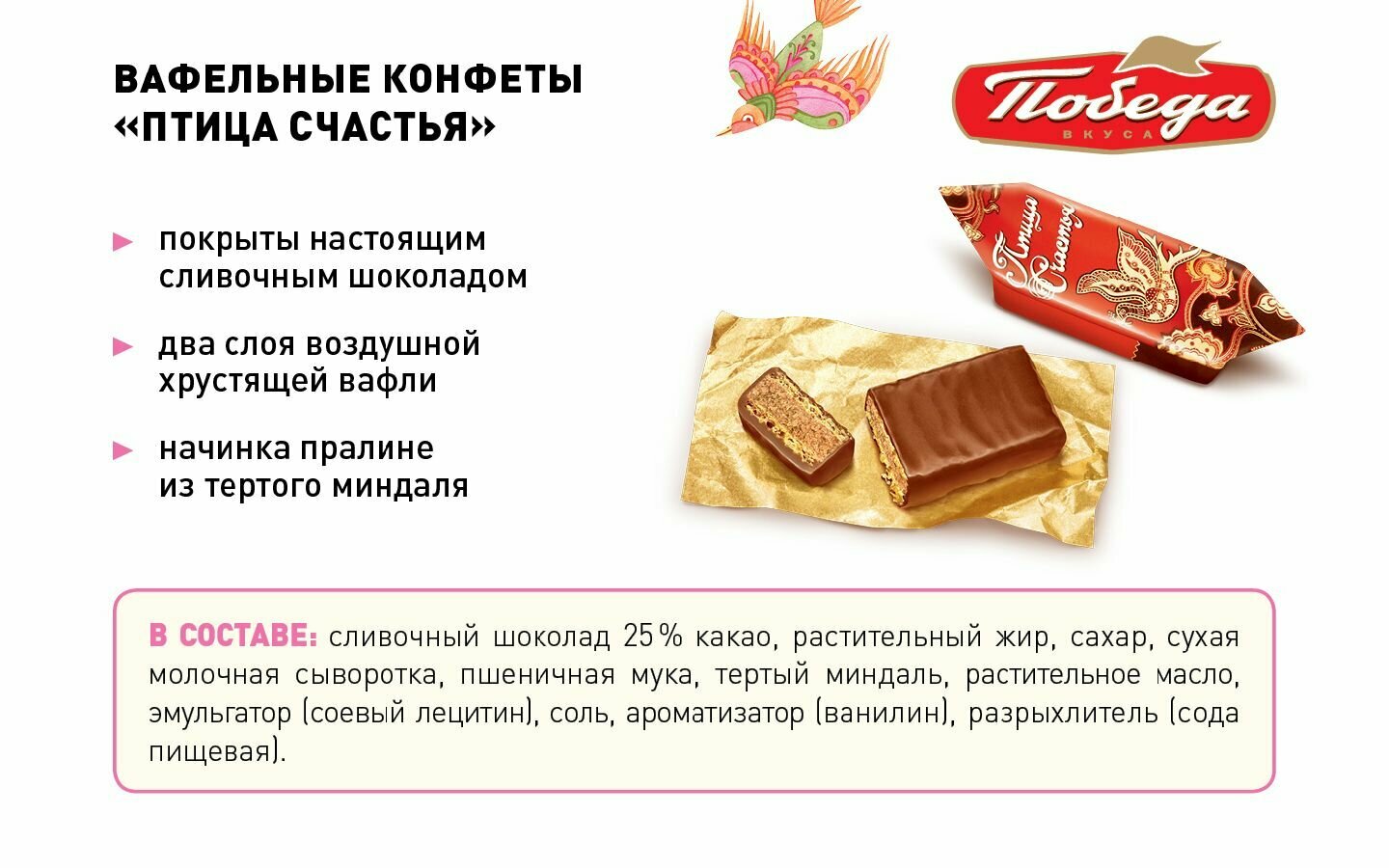 Конфеты Победа вкуса Птица счастья вафельные с начинкой из тертого миндаля в сливочном шоколаде, пакет, 200 г, флоу-пак