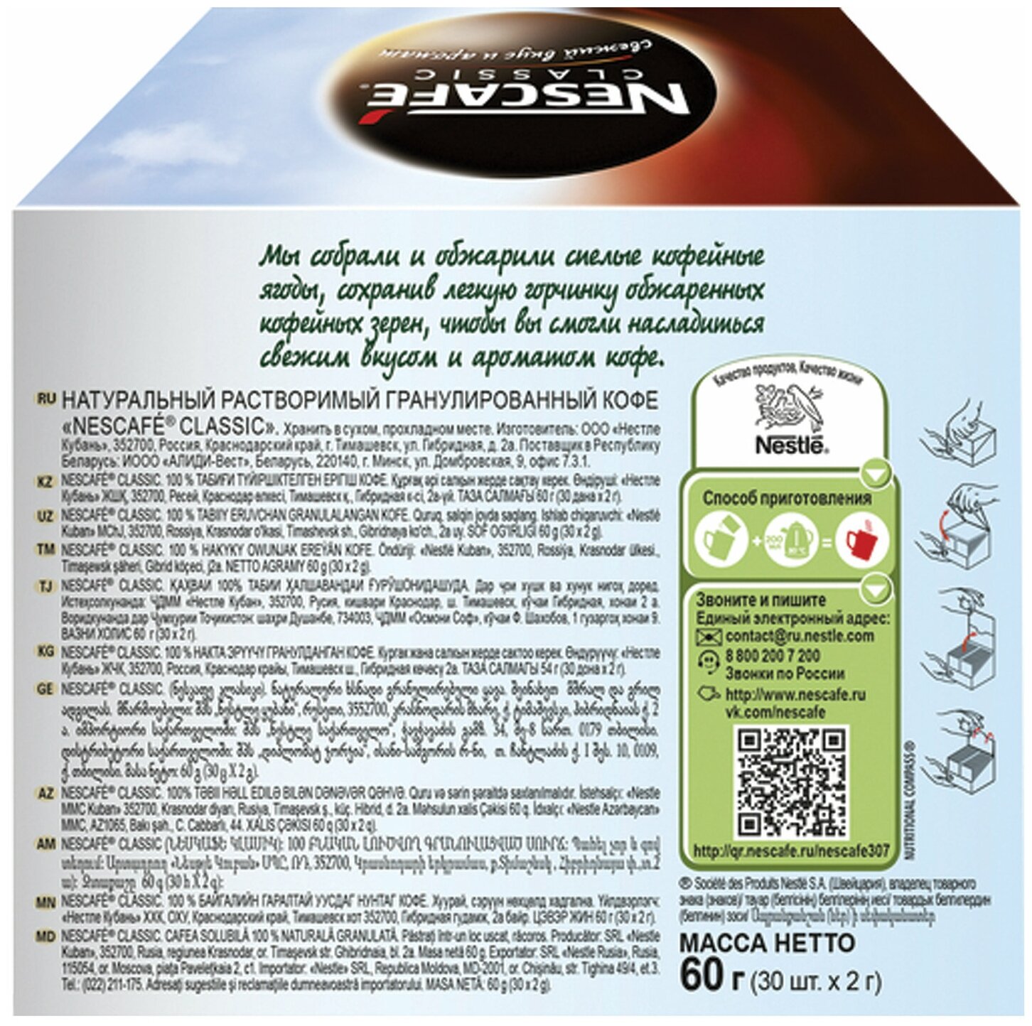 Кофе растворимый Nescafe "Classic", гранулированный/порошкообразный, с молотым, порционный, 30 пакетиков*2г, картонная коробка - 2 шт.