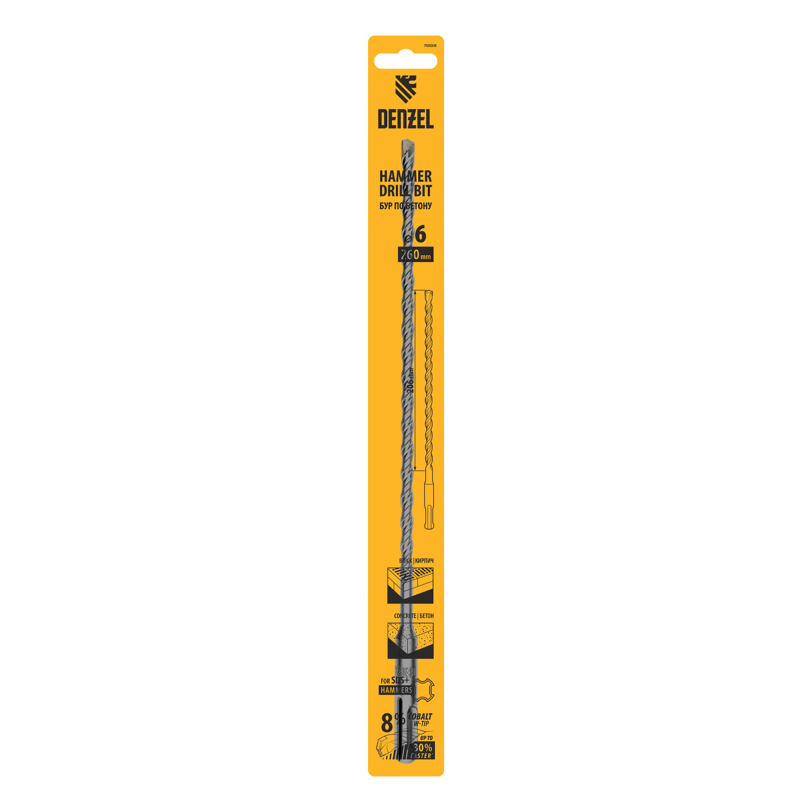 Бур по бетону, двойная спираль, Cobalt W-tip, 6x260 мм, SDS PLUS, DENZEL 705008