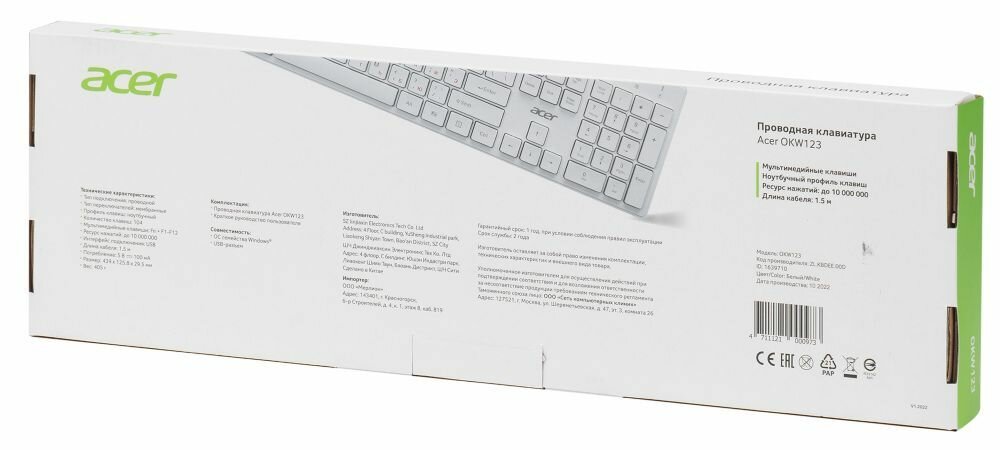 | Комплектация | [Клавиатура Acer OKW123 белый USB (ZL.KBDEE.00D)] X 3 шт. |