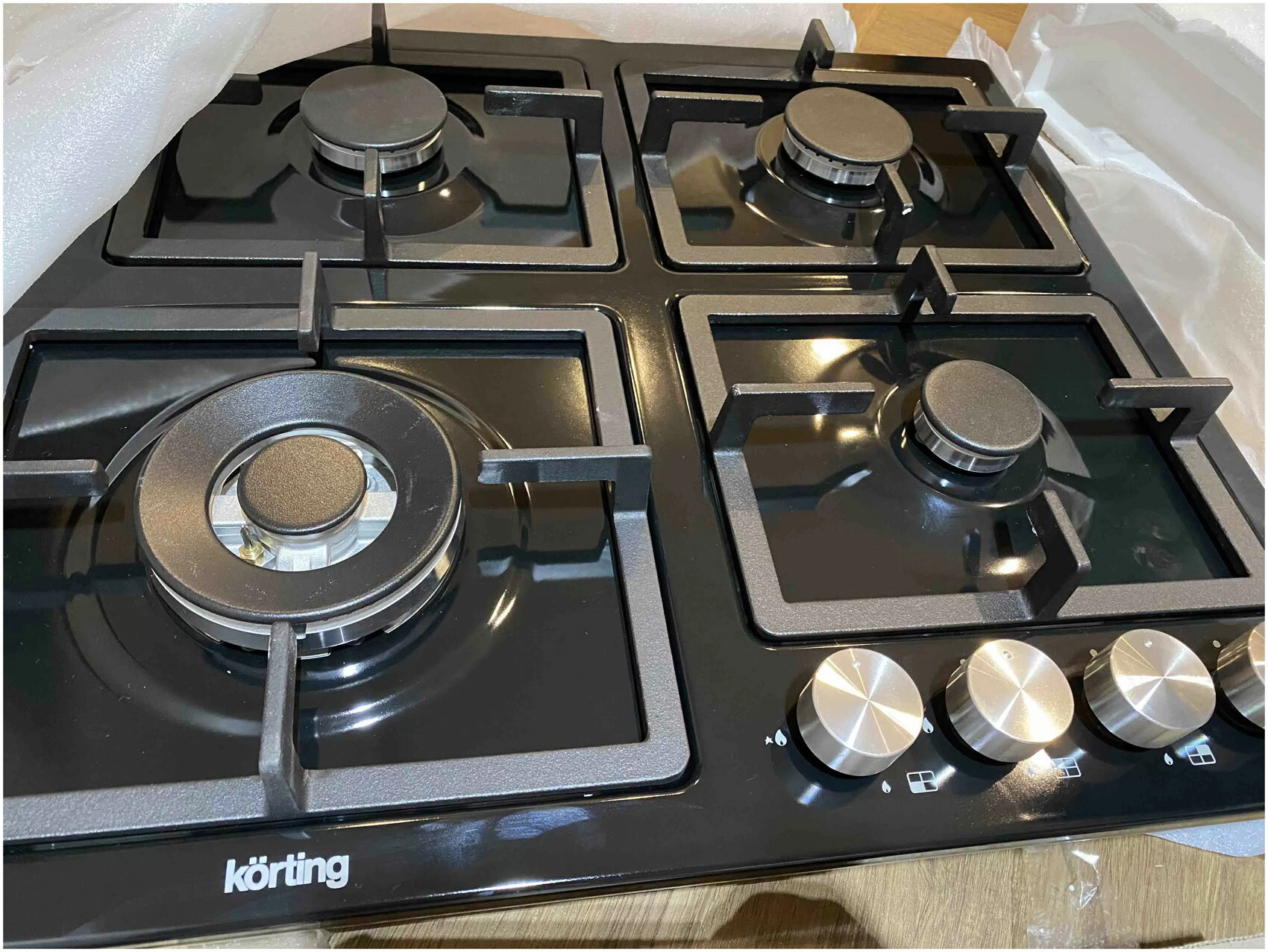 Панель на четыре конфорки, с четырьмя раздельными, но очень прочными и устойчивыми решетками. Поворотные переключатели удобные, расположены спереди. Нагрев быстрый, и также быстро остывает. Есть большая конфорка, мощная, есть газ -контроль и электроподжиг. На сто % нравится панель, производителю 5+ Пользуемся, довольны всем. |