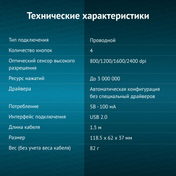 Легкий, отлично отбалансированный корпус. Все матовое, царапин никаких и близко не собирается. Колесико мягко прокручивается, кнопки не заедают. 1200 дпи. Удобный провод. |
